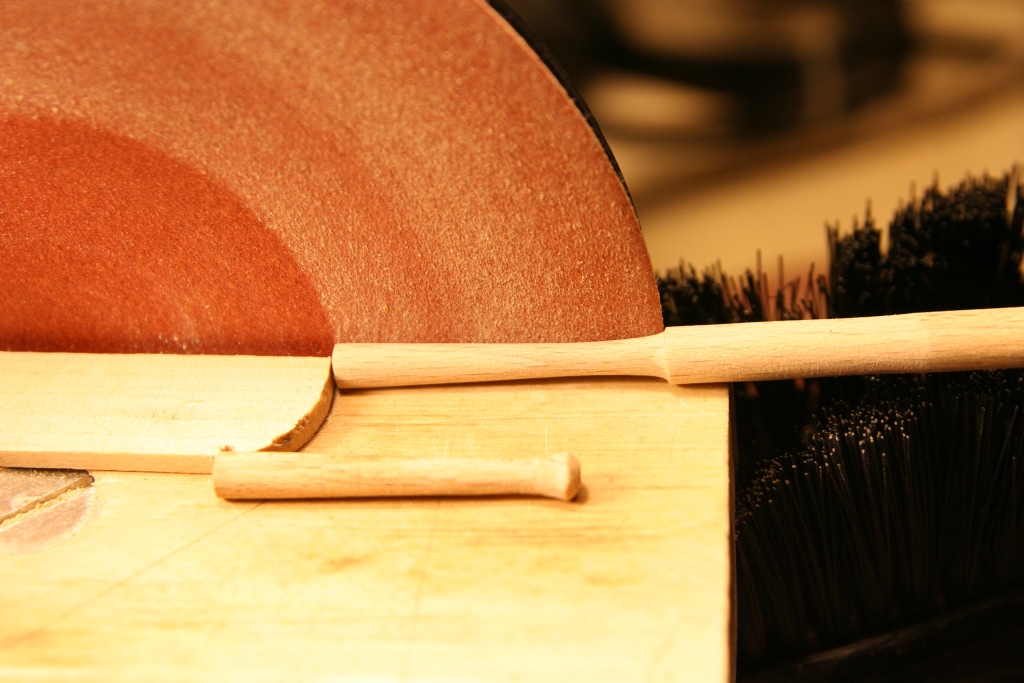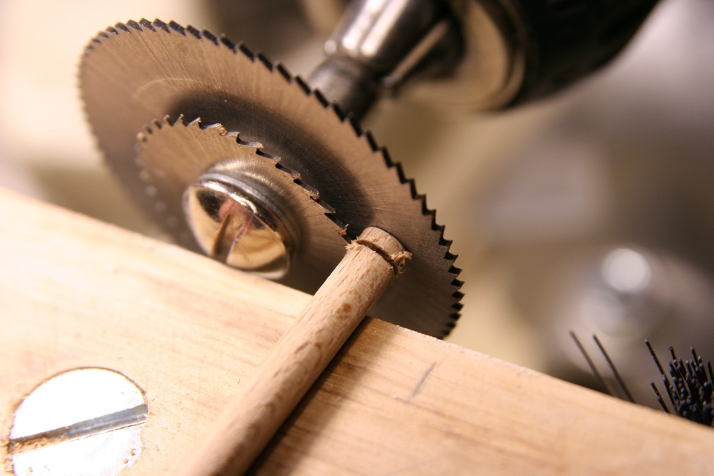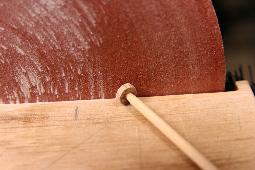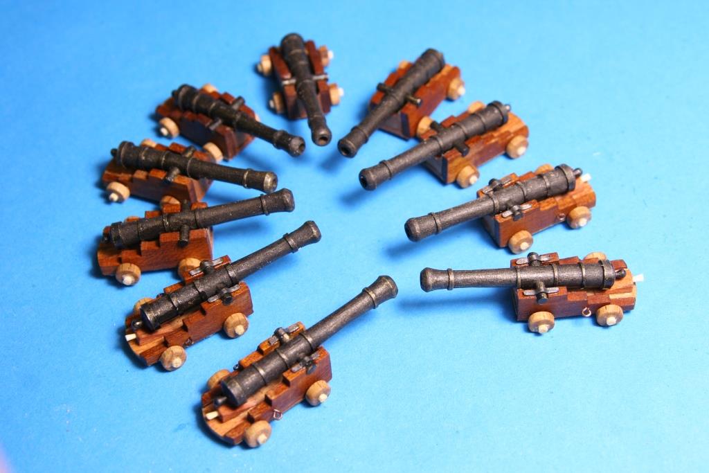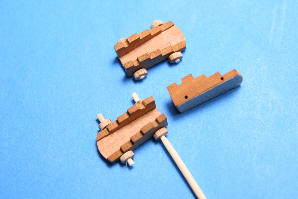 Zmagania z armatami zakończone. Na górnym pokładzie będą widoczne 4 szt i te wykończone trochę bardziej, natomiast pozostałe na dolnym nie będą prawie widoczne. Kolejne zdjęcia pokazują sposób wykonania. Kółka z kołeczka bukowego stopniwo nawiercane żeby zachować centryczne wiercenie i obcinanie na wymiar.