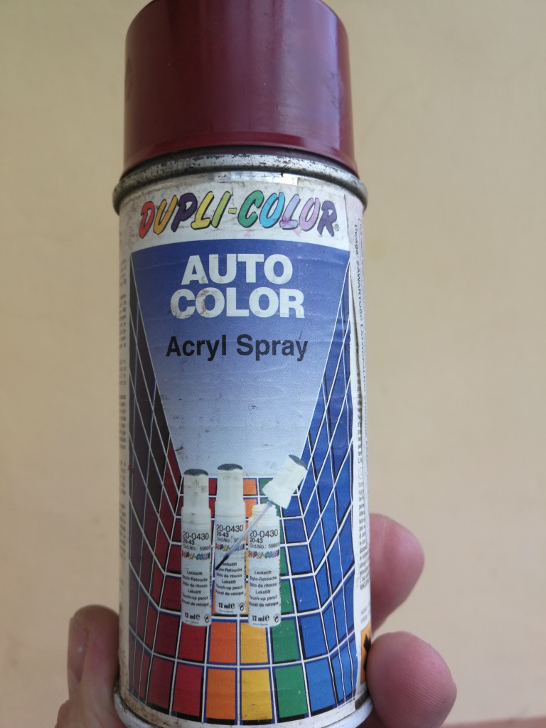 -Czerwona farba - pozostałość po wyprawce na aucie (na zdj puszka i nr na denku ). Uznałem że się zda więc ją wykorzystałem. Dodana niewielka ilość czarnego. Jest to niestety lakier połysk, dlatego po pomalowaniu zmatowiłem powierzchnię nożykiem i wyszedł taki trochę efekt podstarzałej powierzchni.
