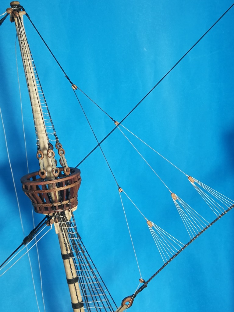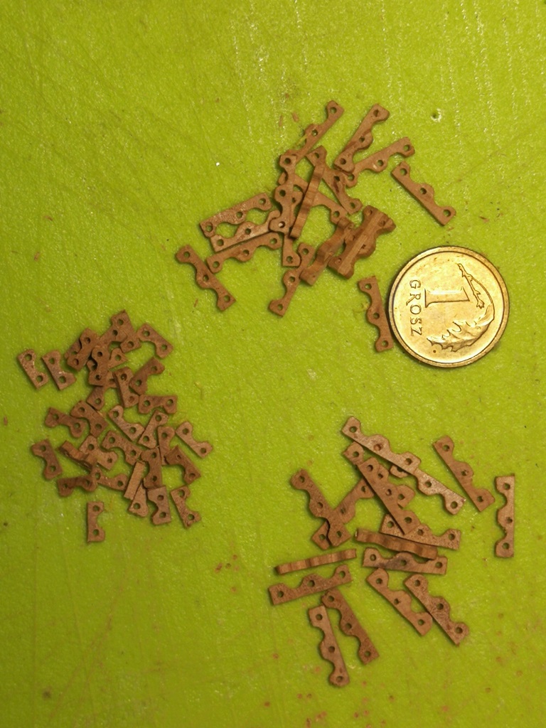 Do zawieszania żagli potrzebne było wykonanie więźby ruchomych rei. Koraliki zrobiłem z modeliny, kuleczki ok 2mm i otworek robiony igłą. W deseczkach wyfrezowałem zagłębienie i następnie pocięte z użyciem stołu krzyżowego. Większość olinowania przednich żagli na swoim miejscu.