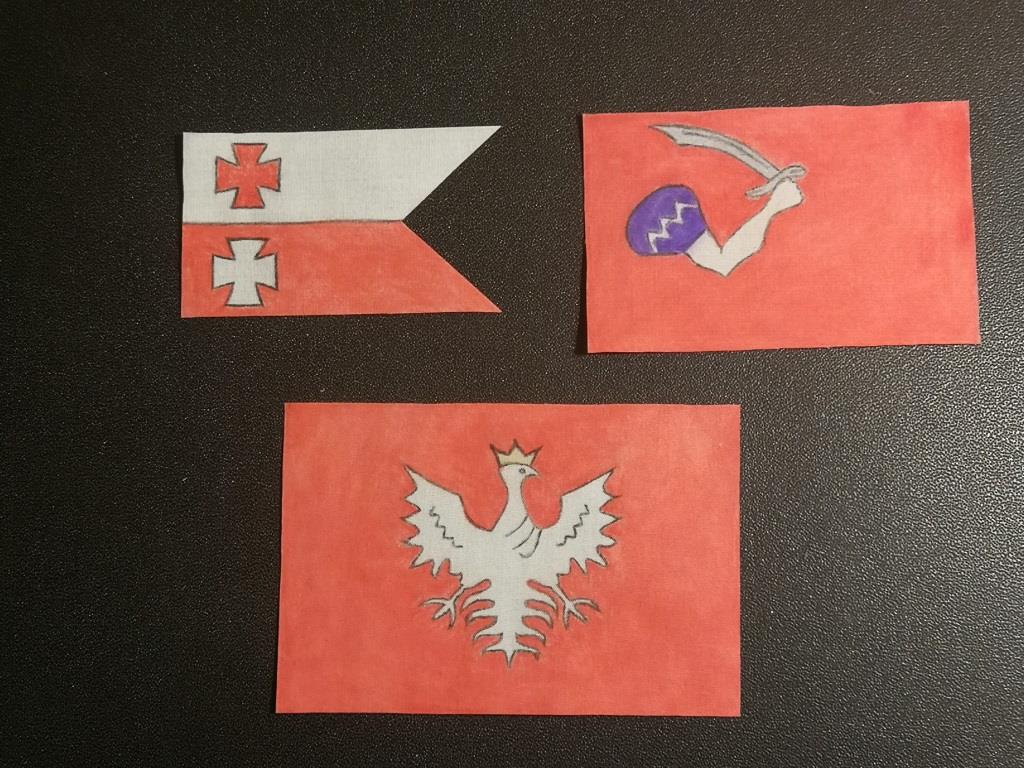 . Jeśli korzystałeś z drukarki.... to ja bym do tego celu wykorzystał wzorce ściągnięte z netu (jest tam tego trochę w różnej jakości): orła z czasów Zygmunta Augusta, proporzec z ramieniem, czy też elbląskie krzyże. Obrabiasz trochę w programie graficznym i puszczasz na drukarkę.