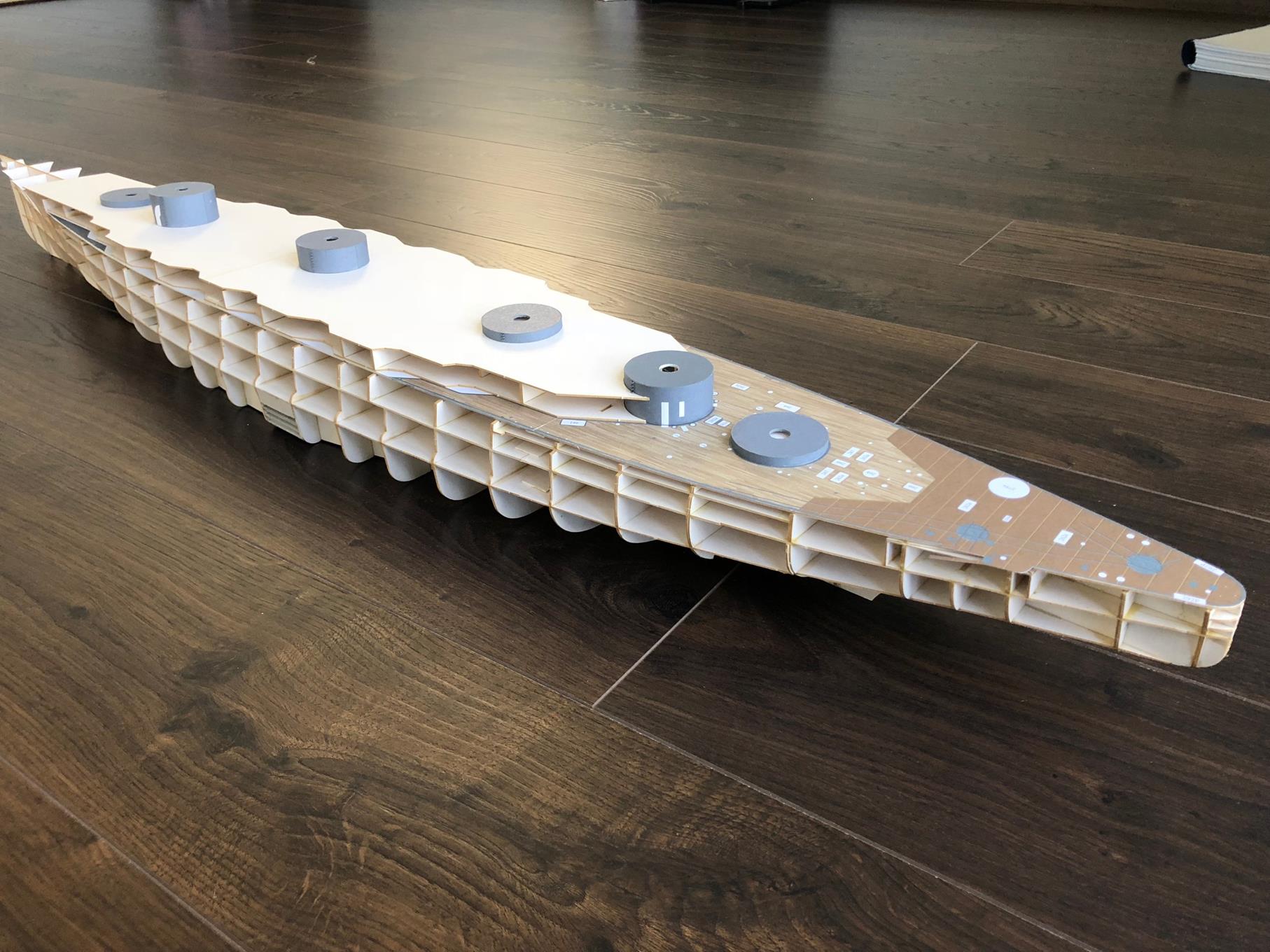 Trwają prace nad wklejaniem wzmocnienia pod poszycie. Jako, że jest to praca żmudna, to wykonałem w ramach ćwiczeń barbety pod działa. Wykonałem również szkielet pokładu kazamatowego. Pokłady przymierzone na kadłub na sucho - wkleję je po wykonaniu wzmocnień.