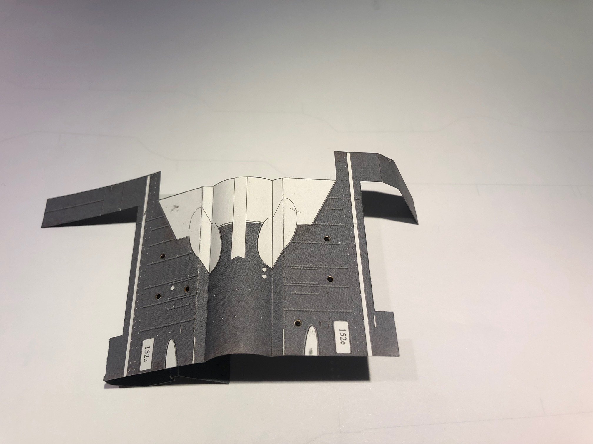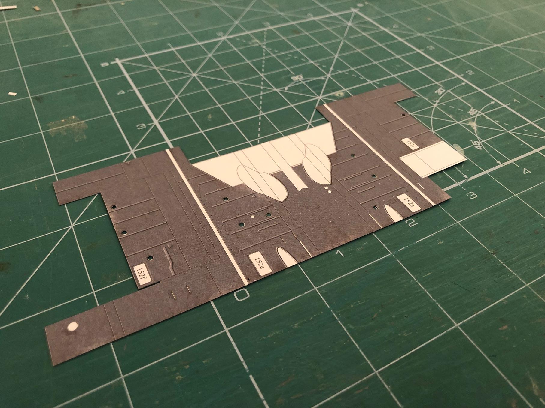 Na rozruszanie palców bo długim niebycie w materii kartonowej zabrałem się za rufową nadbudówkę. Skleiłem szkielet, główną oklejkę wyciąłem, podziurkowałem i rozciąłem na mniejsze elementy - łatwiej mi się tak skleja. Bulaje wybiłem igłą lekarską, przeszklenie z folii pomalowanej na czarno. Obramówki bulajów pomalowane złotą farbą aby imitowało mosiężne okucia. Mistrzostwo świata to nie jest ale coś do przodu i mam nadzieję coraz lepiej.