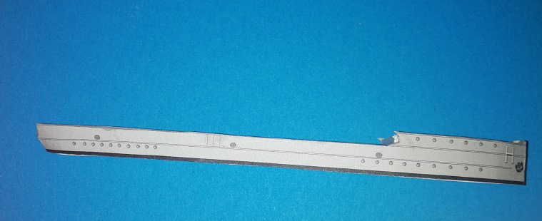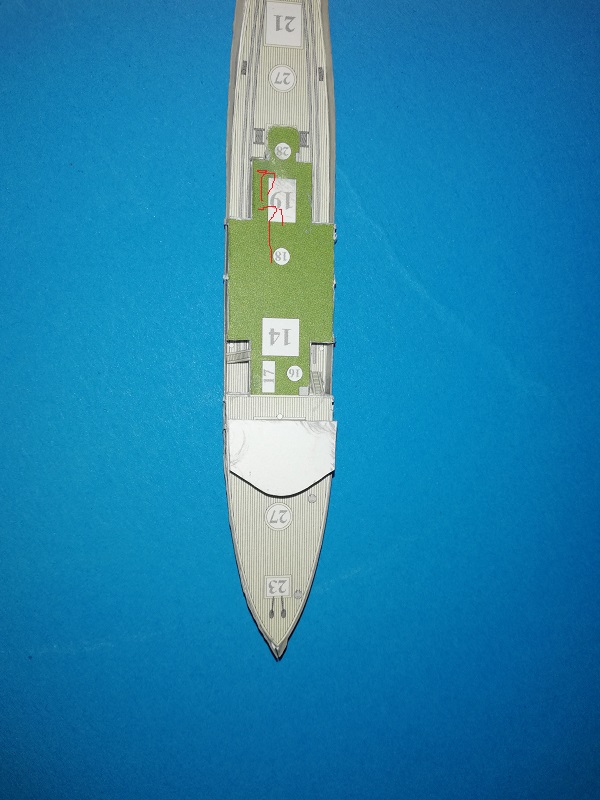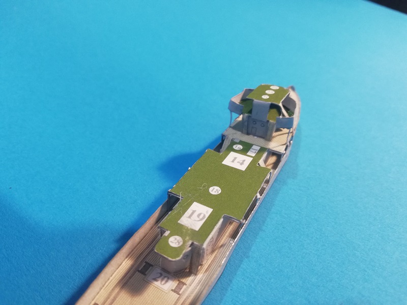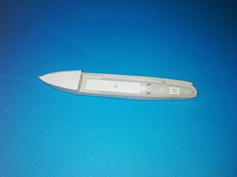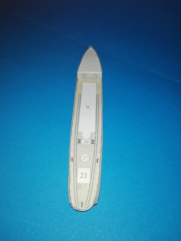 Okleiłem burtami i wkleiłem pokład, niestety przy retuszu wyszedł totalny brak umiejętności retuszerskich co objawiło się brzydkim kleksem farby na zadrukowanej części burty. ( na szczęście na 2 burcie wygląda to lepiej). A jak by tego było mało na początku budowy źle wymodelowałem rufę co zaowocowało obecnie totalnym nie ułożeniem się wyciętych części.....