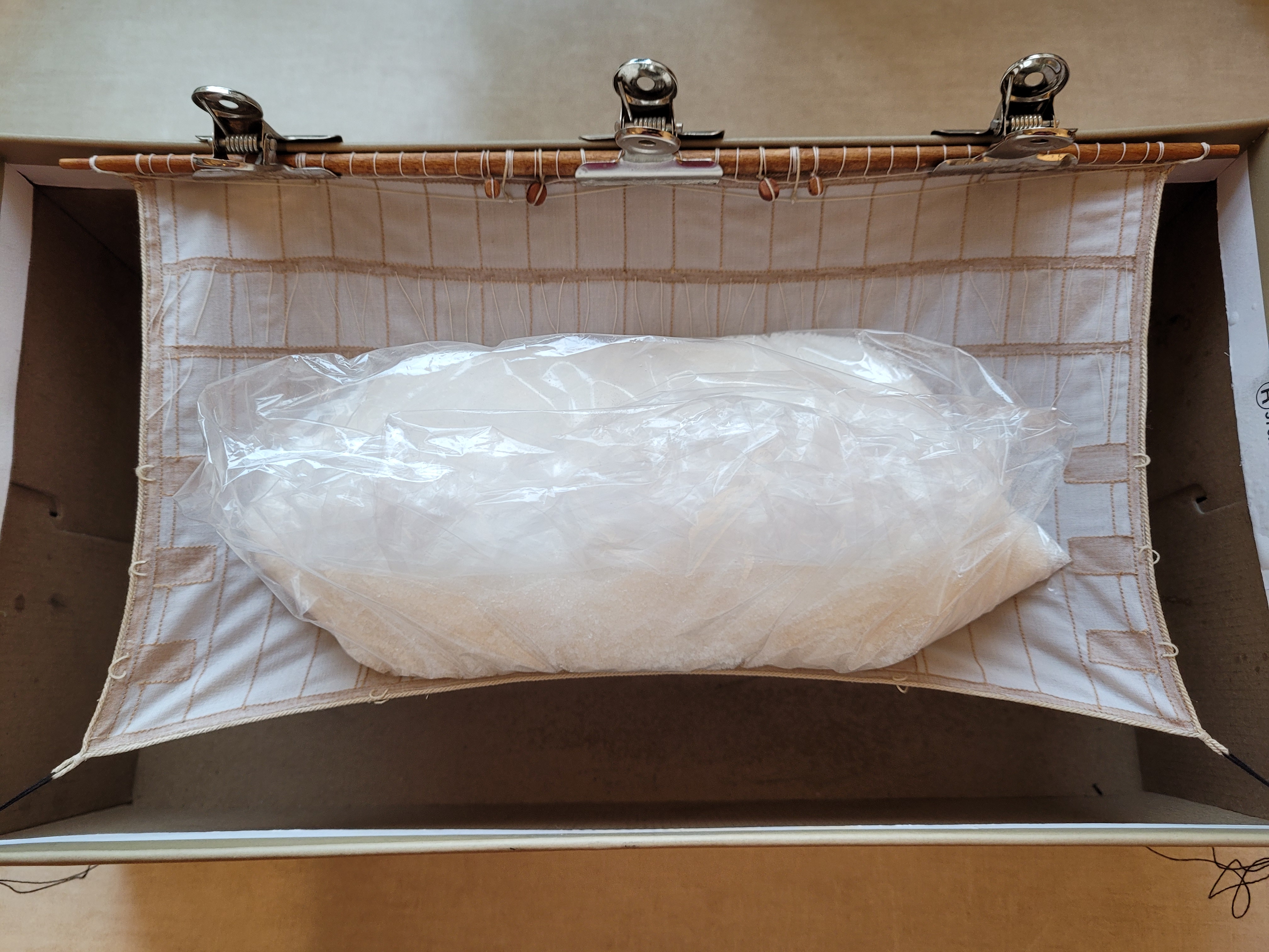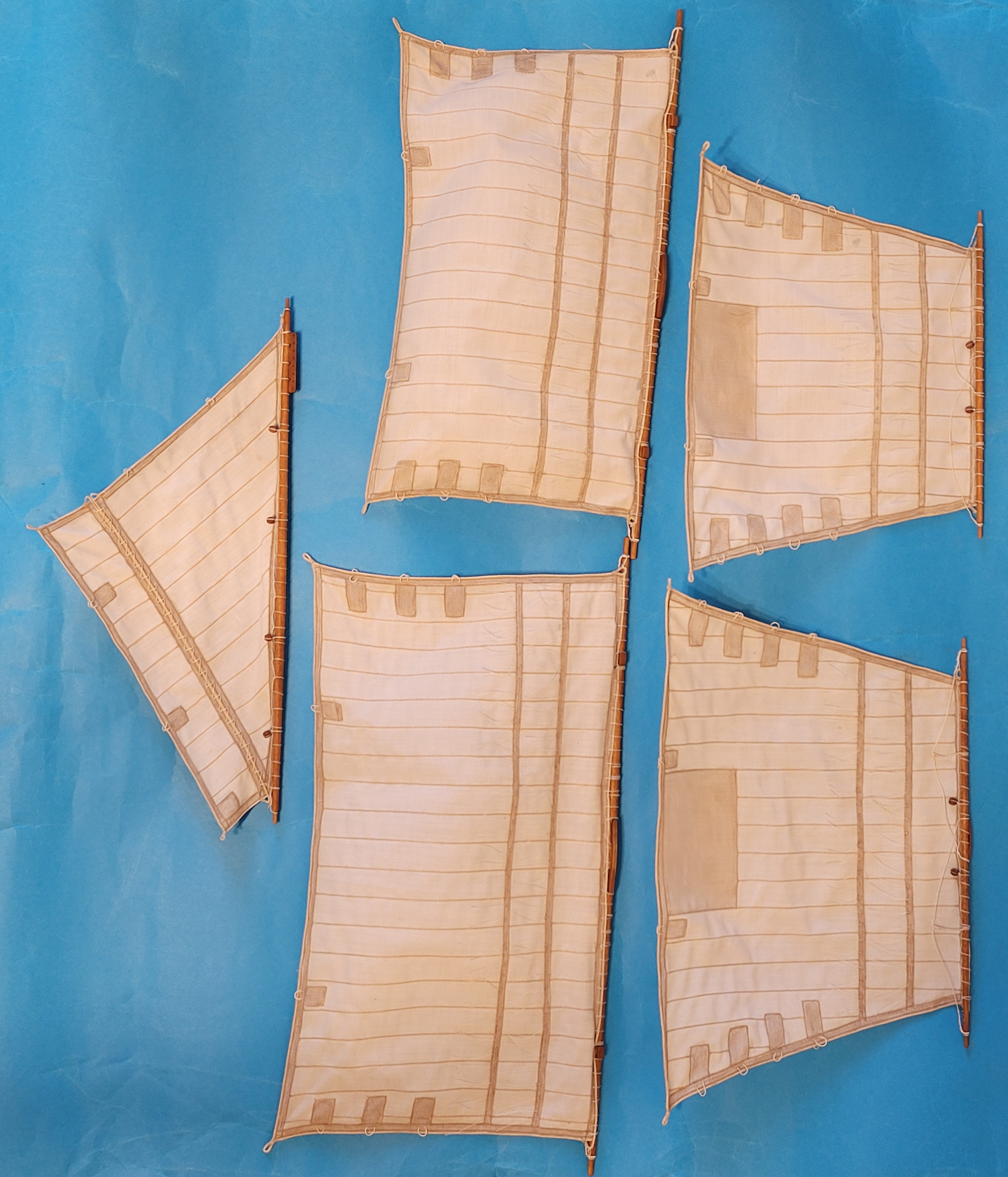 Nadszedł czas przygotowań do zawieszania żagli. Reje wykonane i powiązane z żaglami. Efekt wypełnienia wiatrem robiłem znanym i wielokrotnie przedstawianym sposobem przez namoczenie krochmalem (użyłem gotowego w sprayu) i dociążenie woreczkiem z cukrem.