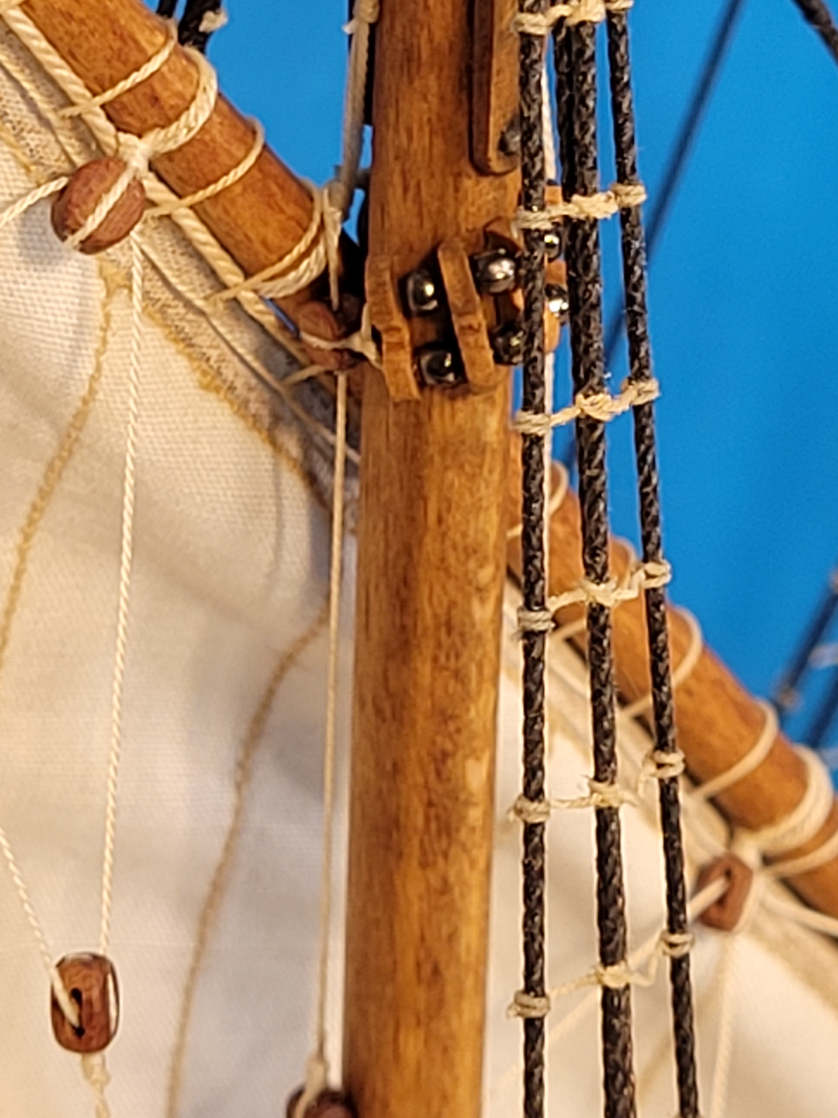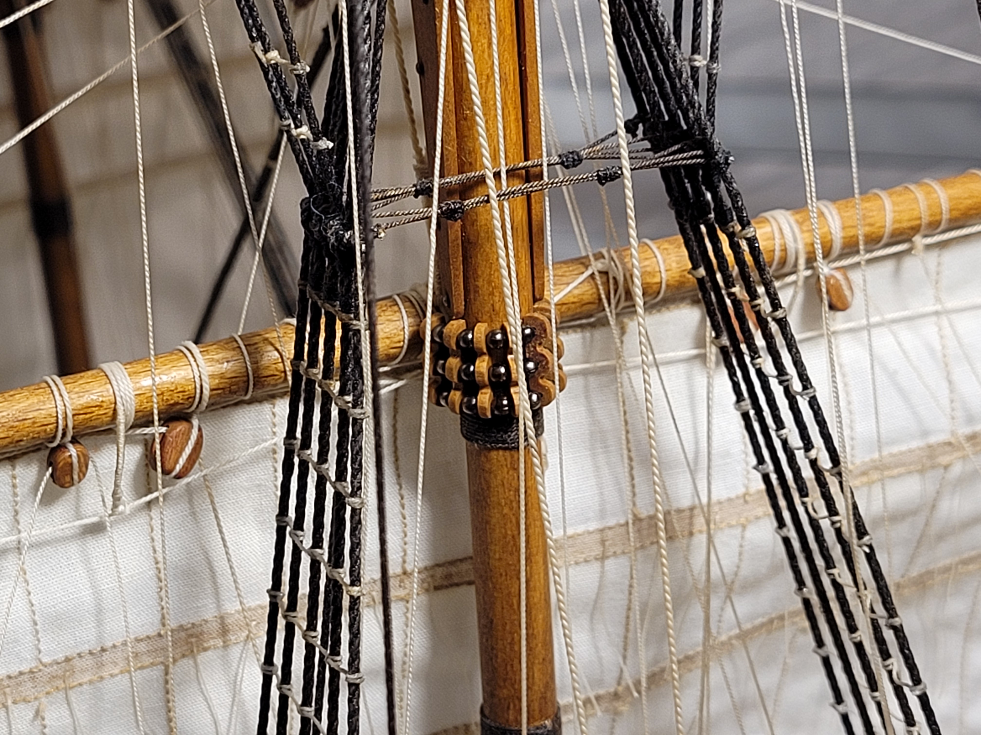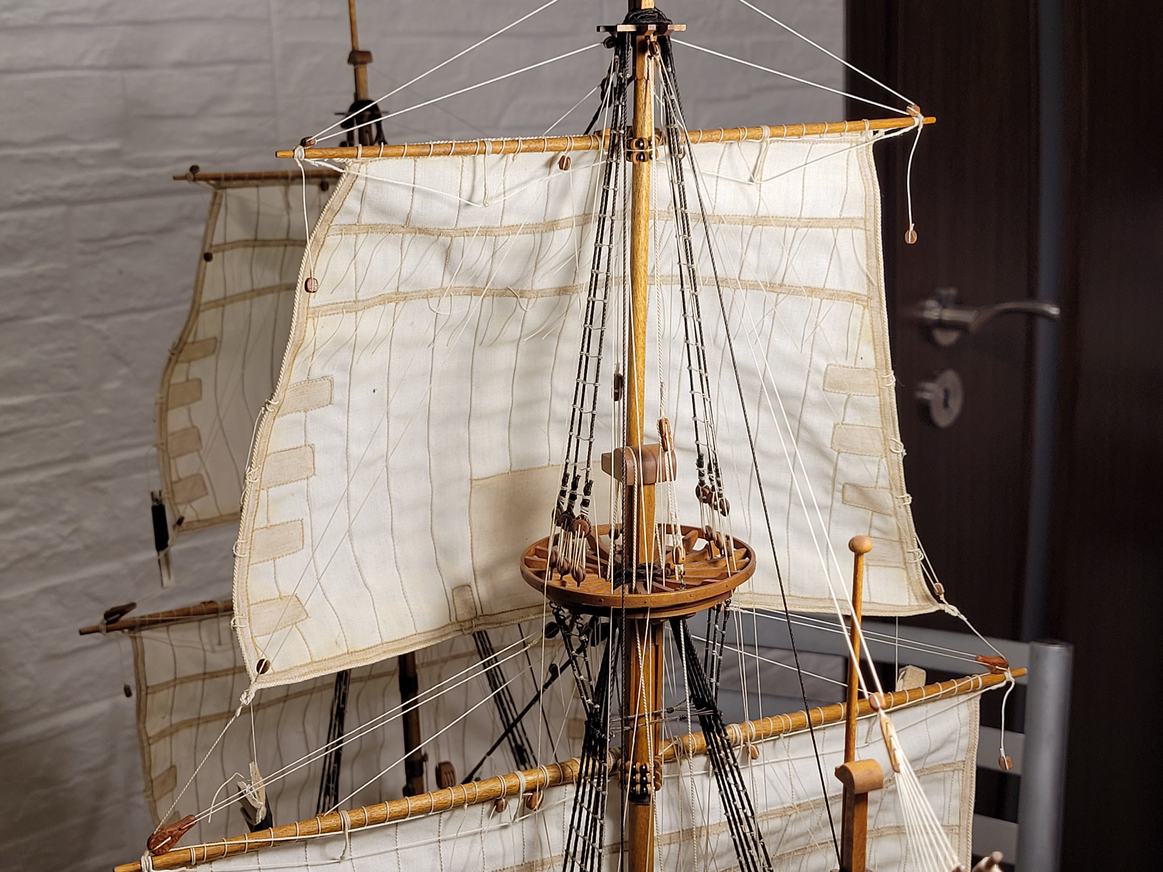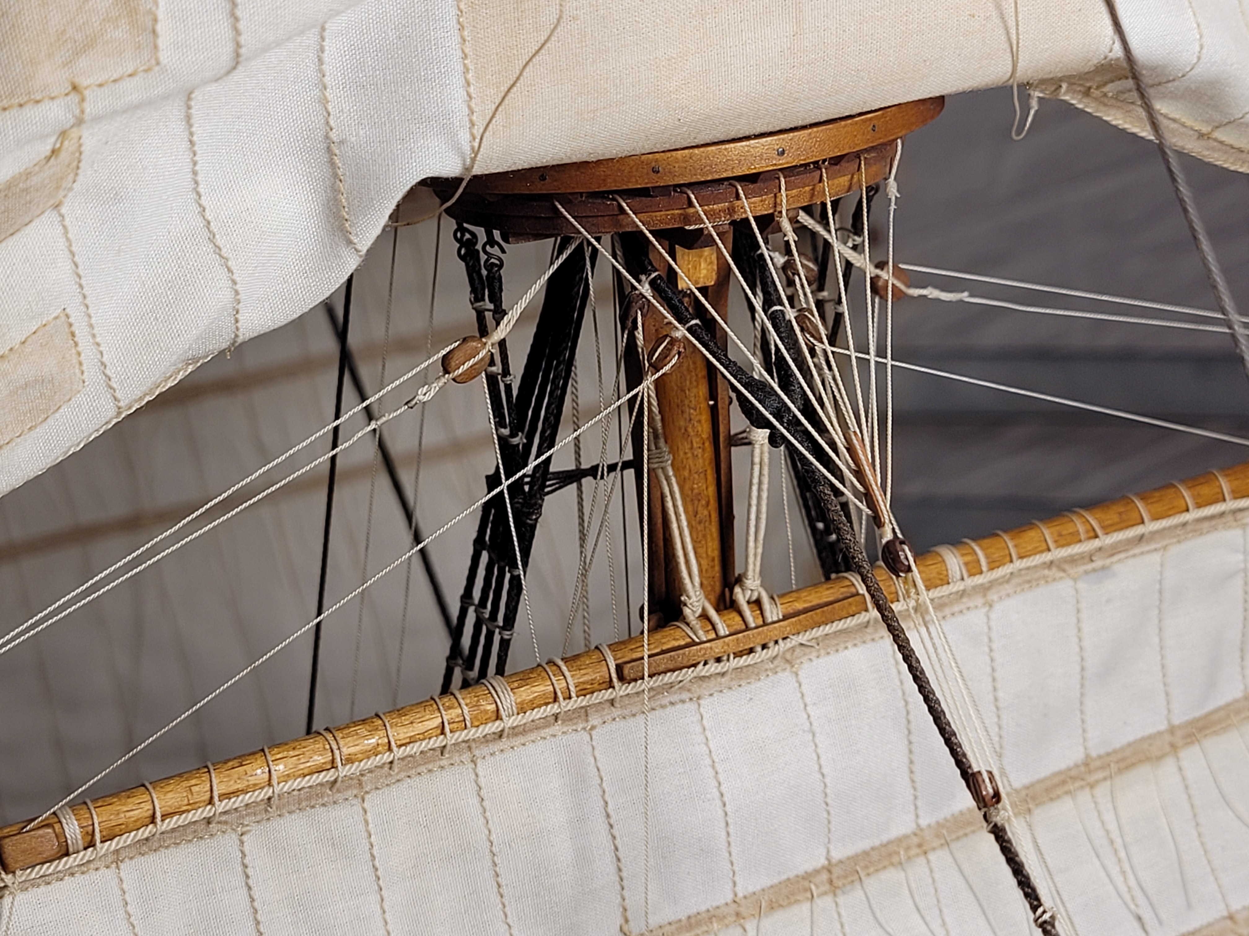 Prace przy żaglach w trakcie. Żagle grota i foka zawieszone i powiązana większość lin oprócz szotów, kontra-szotów, brasów i bulin. Stwierdziłem, że korzystniej jest najpierw zawiesić wszystkie główne żagle i na końcu zająć się wymienionymi linami które biegną wzdłuż okrętu i wcześniej zawieszone przeszkadzałyby przy zawieszaniu kolejnych żagli.
