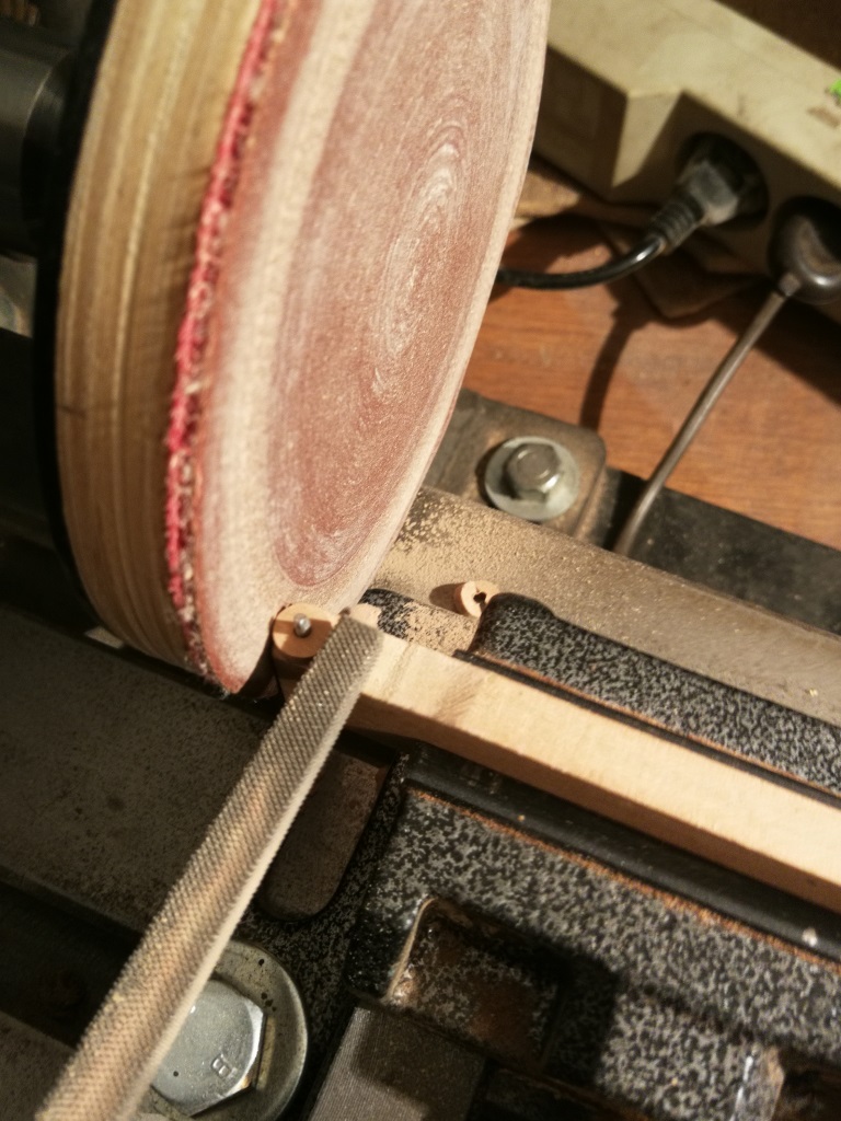 Kółka do lawet zrobiłem z pomocą stołu krzyżowego. W imadle zamocowana listewka z gwoździem pełniacym rolę osi prowadzącej. Dosuwając stopniowo stół do szlifierki i obracając "nadzianym" kwadratem uzyskujemy kółka o powtarzalnej średnicy. Idzie to naprawdę szybko. Zrobione dwie średnice na przód i tył lawety i do tego osie.