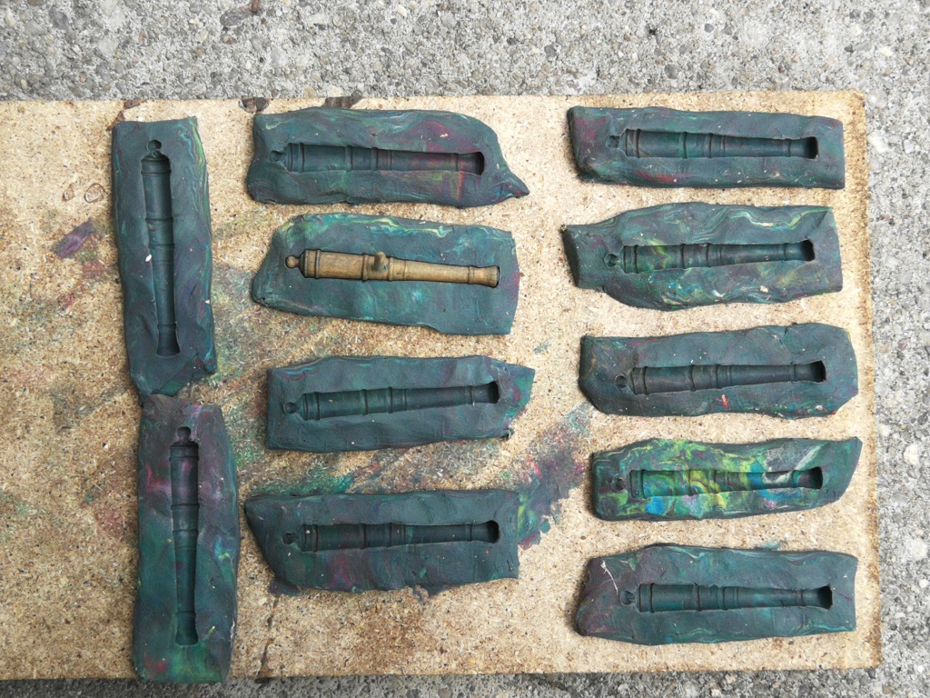 Zmagań z armatami ciąg dalszy. Oczywiście można kupić gotowe lufy ale satysfakcja z tego żadna w porównaniu z własnoręcznym wykonaniem (przynajmniej jak dla mnie). Na początek wytoczyłem wzór lufy z gruszy, która posłużyła do odciskania form w plastelinie. Formy zalewałem żywicą poliestrową zmieszaną z talkiem. Po doszlifowaniu połówek, odlewy sklejane ze sobą CA.