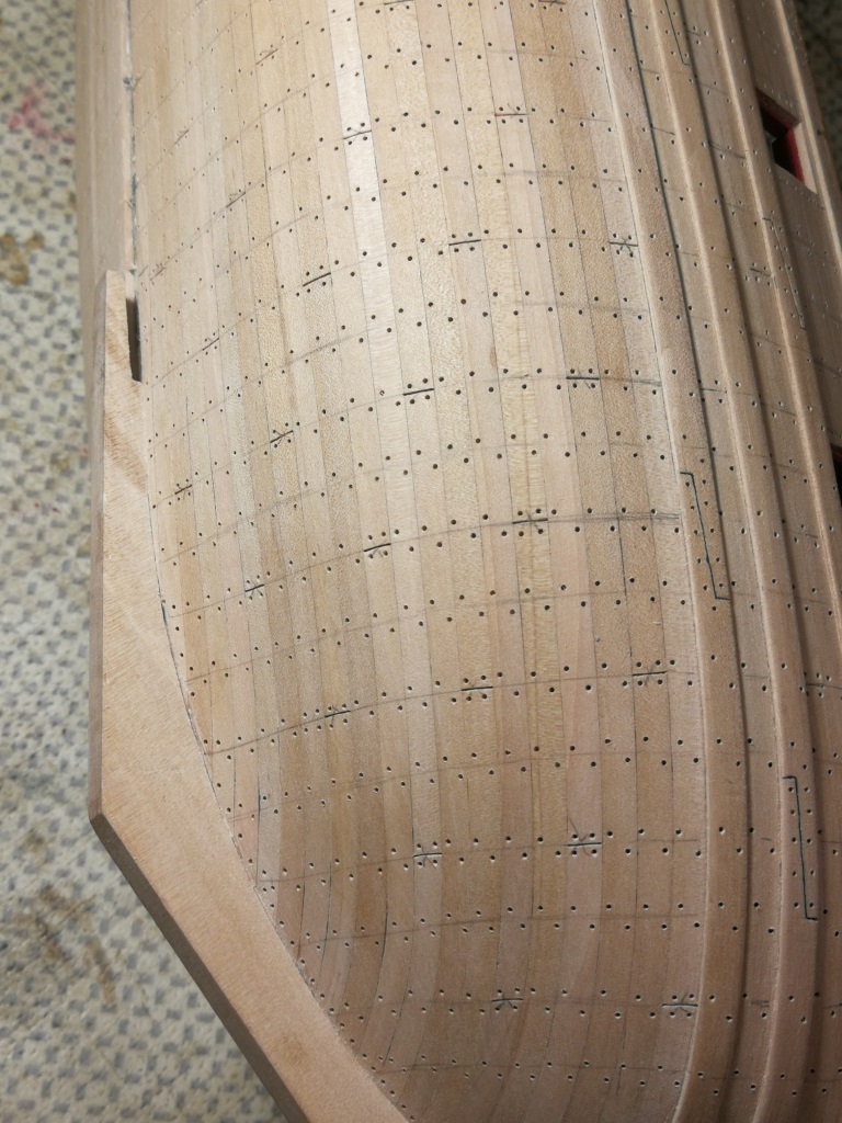 Poszywanie kadłuba powoli dobiega do końca. Ostatnie kilka planek biegnie po stewie rufowej, dlatego wkleiłem ją przed zakończeniem poszywania. W miejscu gdzie biegną planki oczywiście musiała zostać pocieniona.