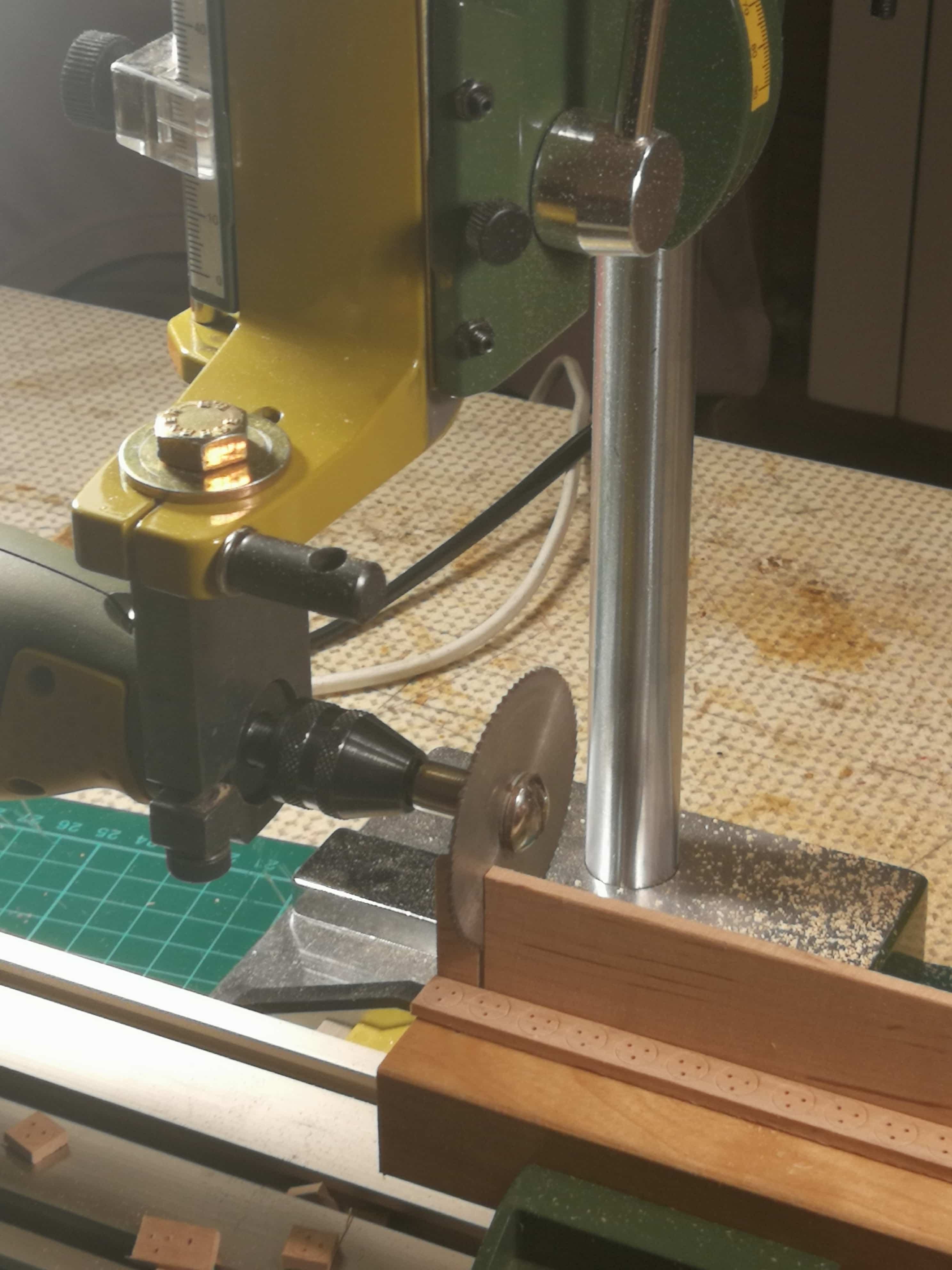 5. Rozcinanie listewki na pojedyńcze sztuki - rozcinałem z użyciem stojaka proxxona MB200 zmodyfikowanego o doroboną przystawkę umożliwiającą zamocowanie piłki w poziome. To pozwala na zachowanie przesuwu w pionie i wykonanie ekspresowego pocięcia takich elementów.