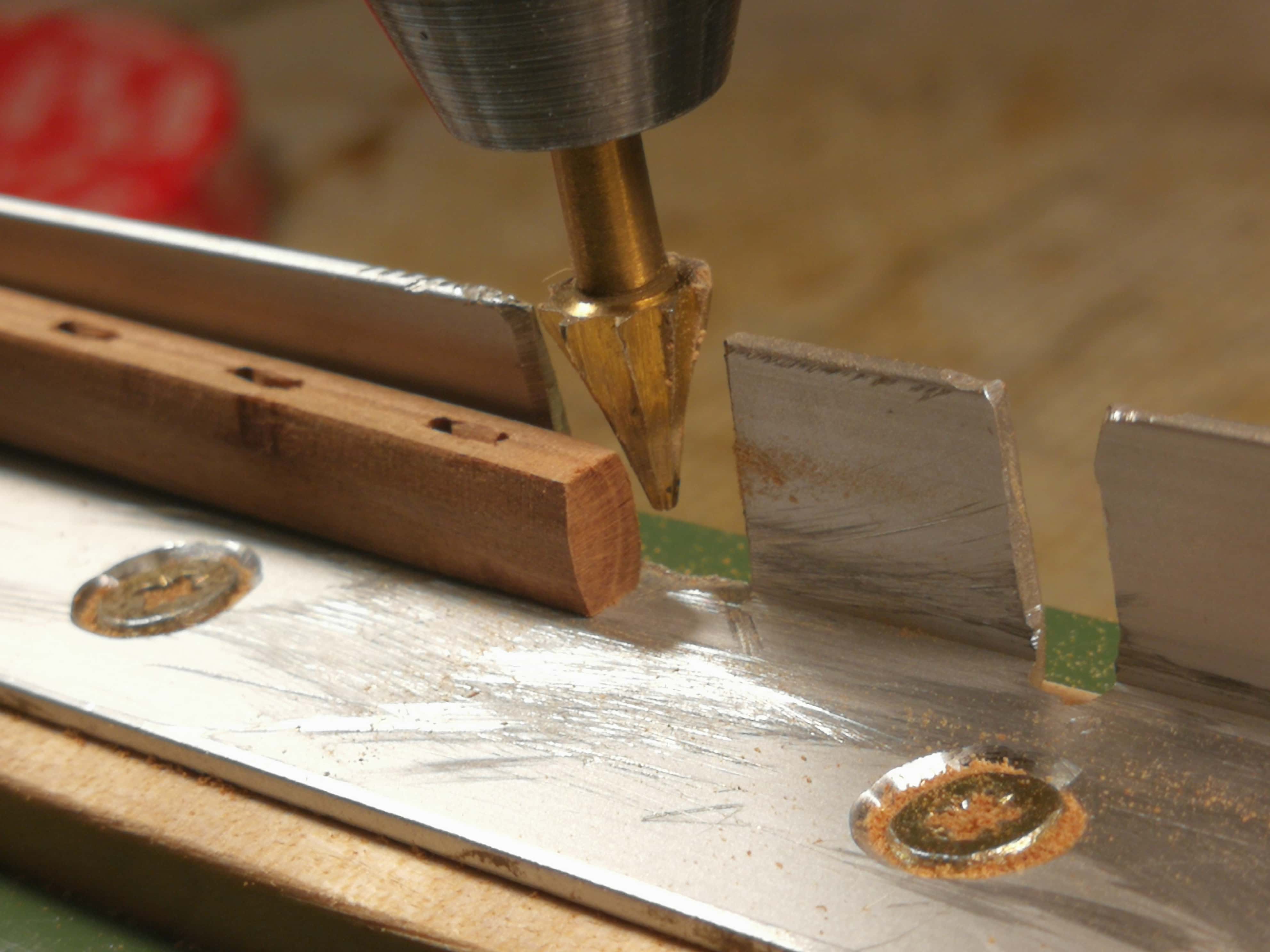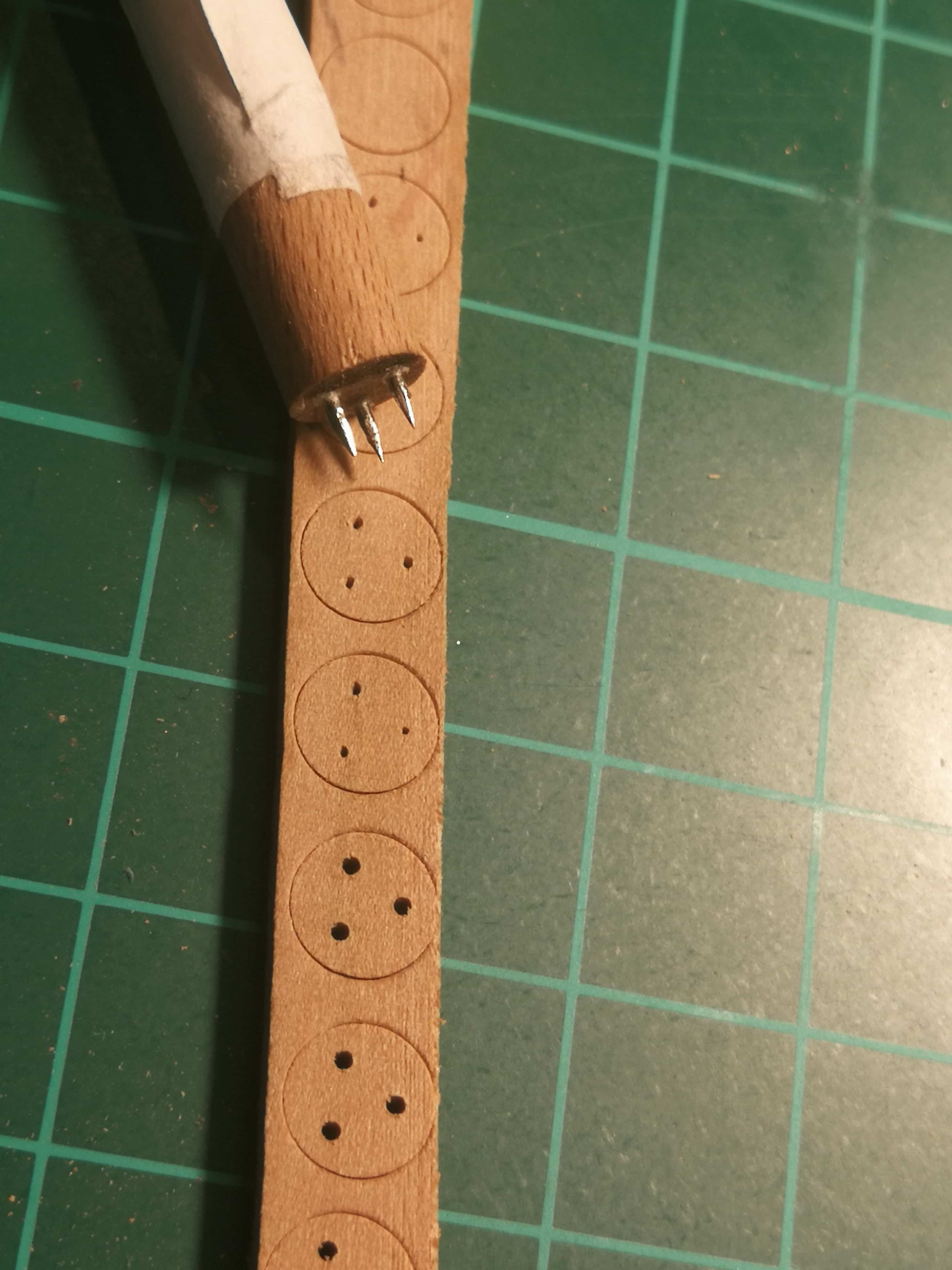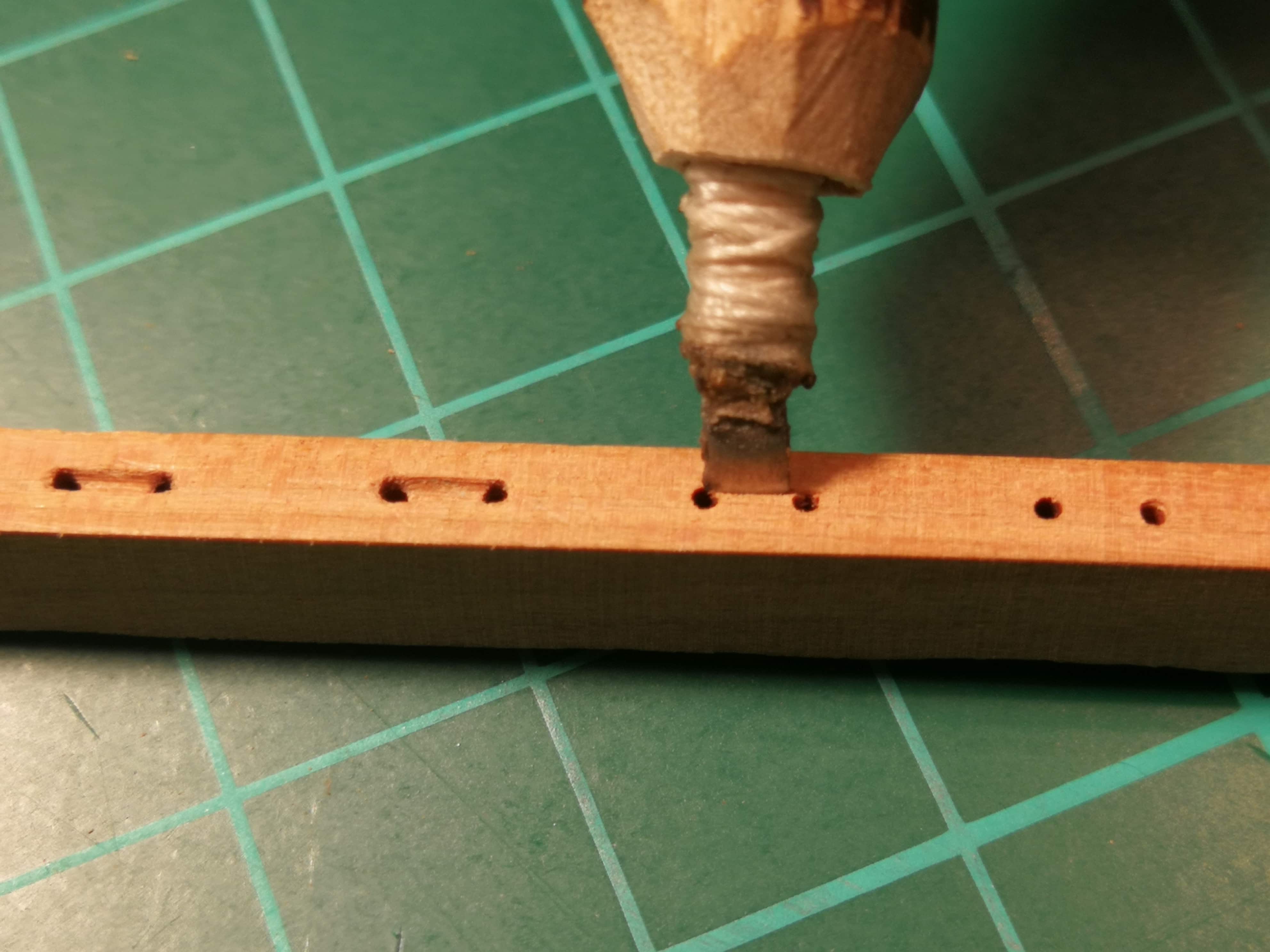 3. Wykonanie rowka pomiędzy otworami - zacząłem kombinować z frezowaniem, ale za dużo kręcenia i czasu. Szybciej można to wyciąć skalpelem lub takim przygotowanym dłuteczkiem z kawałka ostrza.