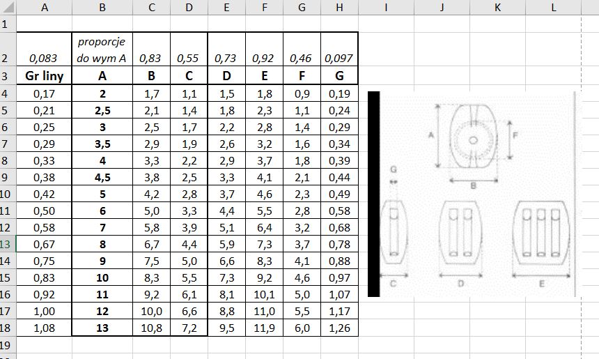 1. Przygotowanie listewek o przekroju odpowiadającemu danemu rozmiarowi - posłużyłem się tabelą z Mondfelda i na tej bazie przygotowałem tabelkę w excel z przelicznikami dla poszczegółnych rozmiarów.