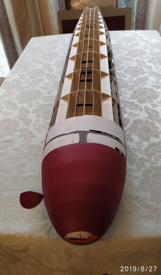 Przy oklejaniu szkieletu postanowiłem zastosować metodę skorupowego układania poszycia od linii wodnej wzwyż. Dla „gładkiego” cielska kadłuba kluczowym było dobre połączenie segmentów, bez uskoków.