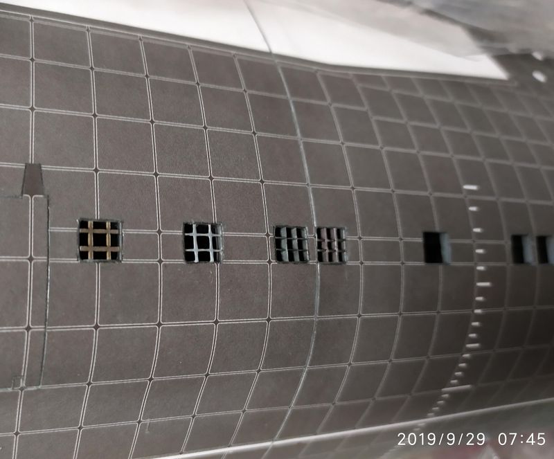 Podobną metodę zastosowałem w poszyciu dna. Tam jednak w otwory wklejałem paski, tak jak na zachowanej fotografii wraku okrętu.