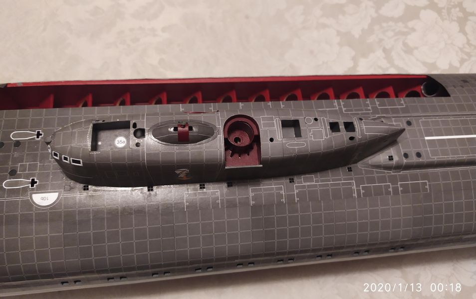 - od podstaw wykonałem w dziobowej części okrętu luk do załadunku torped z wieloma detalami wyposażenia oraz samą torpedę, której kolory zaczerpnąłem z fotografii oryginału i z kadrów filmu.