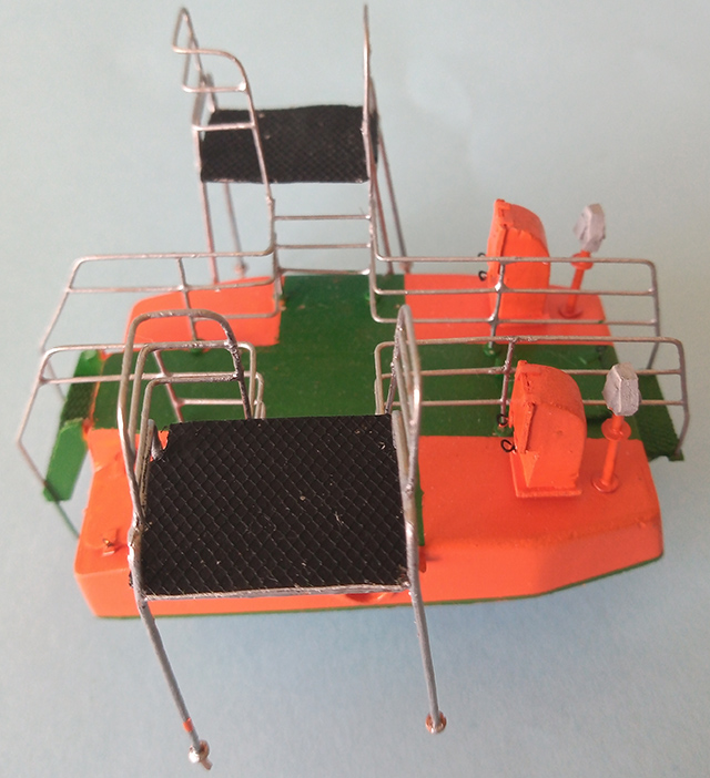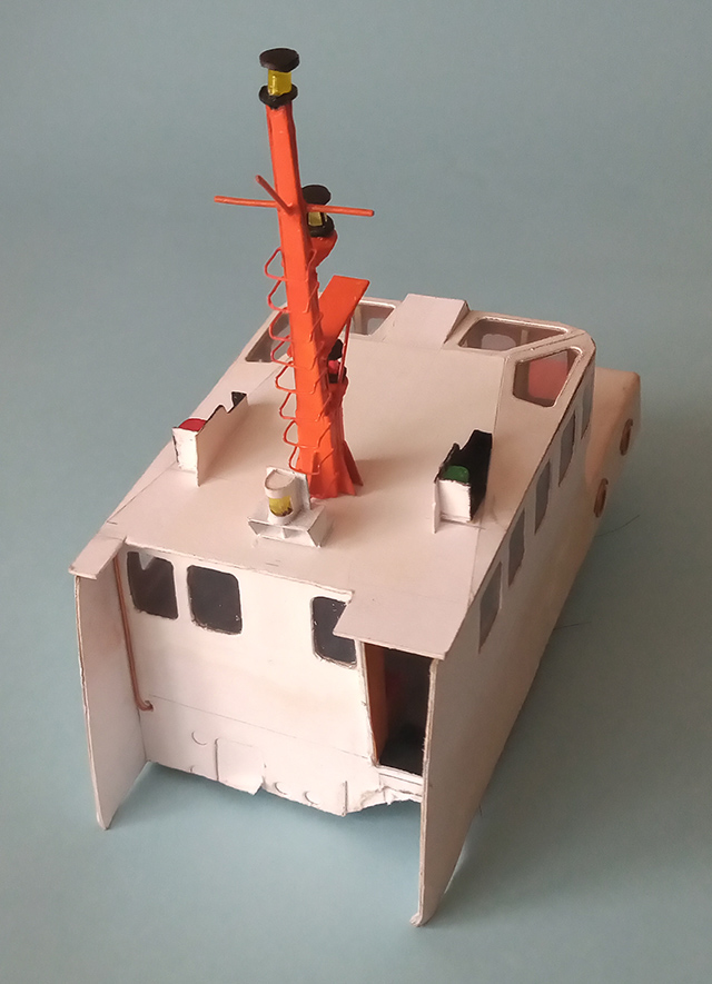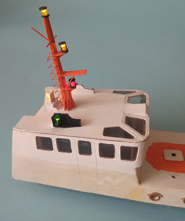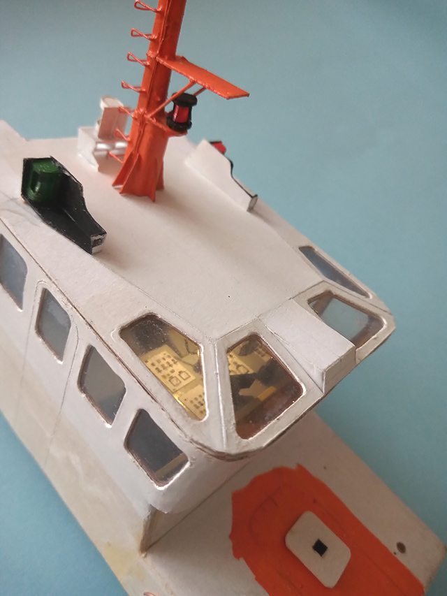Dalszy ciąg lepienia .Przybył maszt na dachu sterówki więc połączyłem to w całość . Jak przewidywałem pomimo sporych okienek w sterówce będzie mało co widoczne . Zabezpieczyłem się robiąc wewnątrz oświetlenie , zrobiłem też działające oświetlenie masztu i świateł pozycyjnych