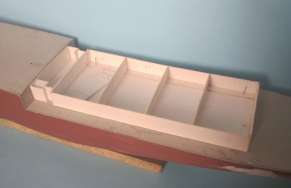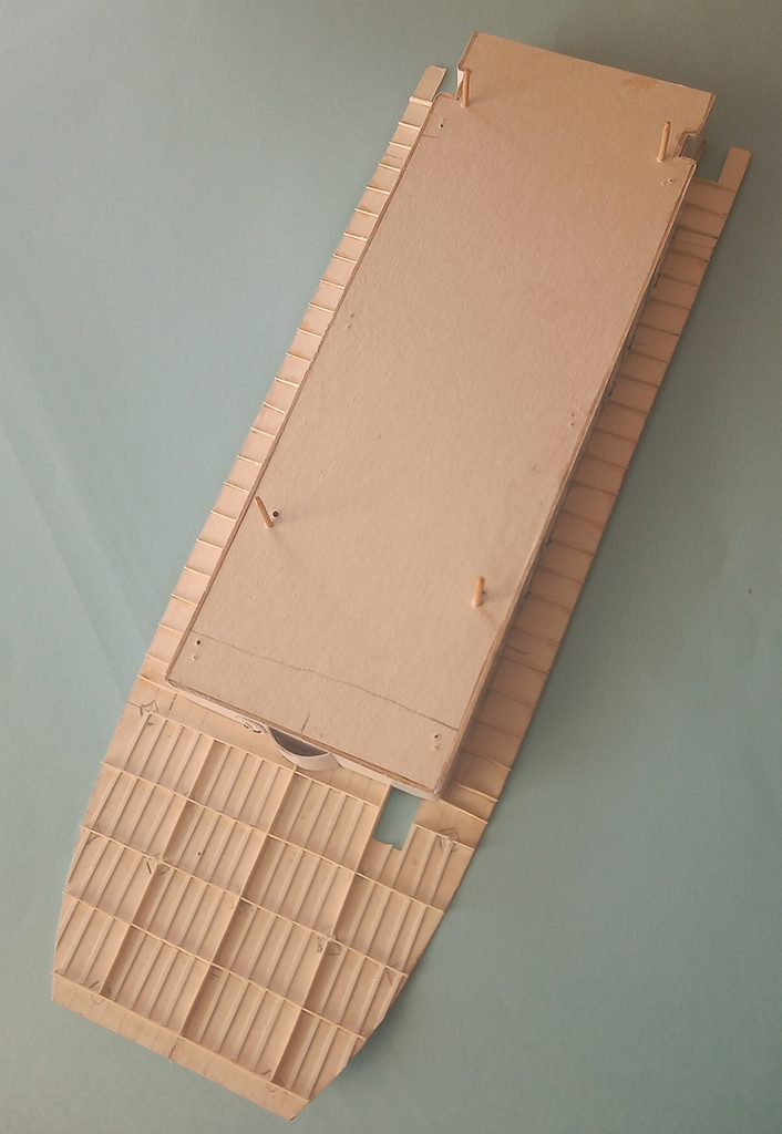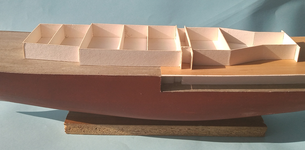 Dalszy ciąg lepienia - pokład oklejony "deskami" z forniru i zaczęta następna nadbudówka