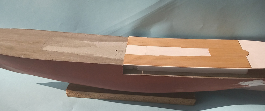 Dalszy ciąg lepienia - pokład oklejony "deskami" z forniru i zaczęta następna nadbudówka