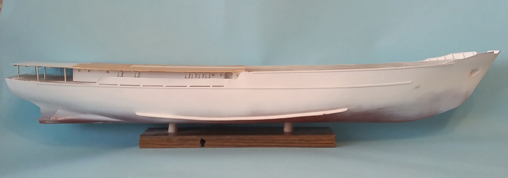 Udało się poszyć cały kadłub . Pomalowałem wstępnie caponem i po przeszlifowaniu zaszpachlowałem. Jak wyschła szpachlówka szlifowanie a następnie pryśnięcie podkładem . Kadłub schnie to zabrałem się za lepienie nadbudówki.