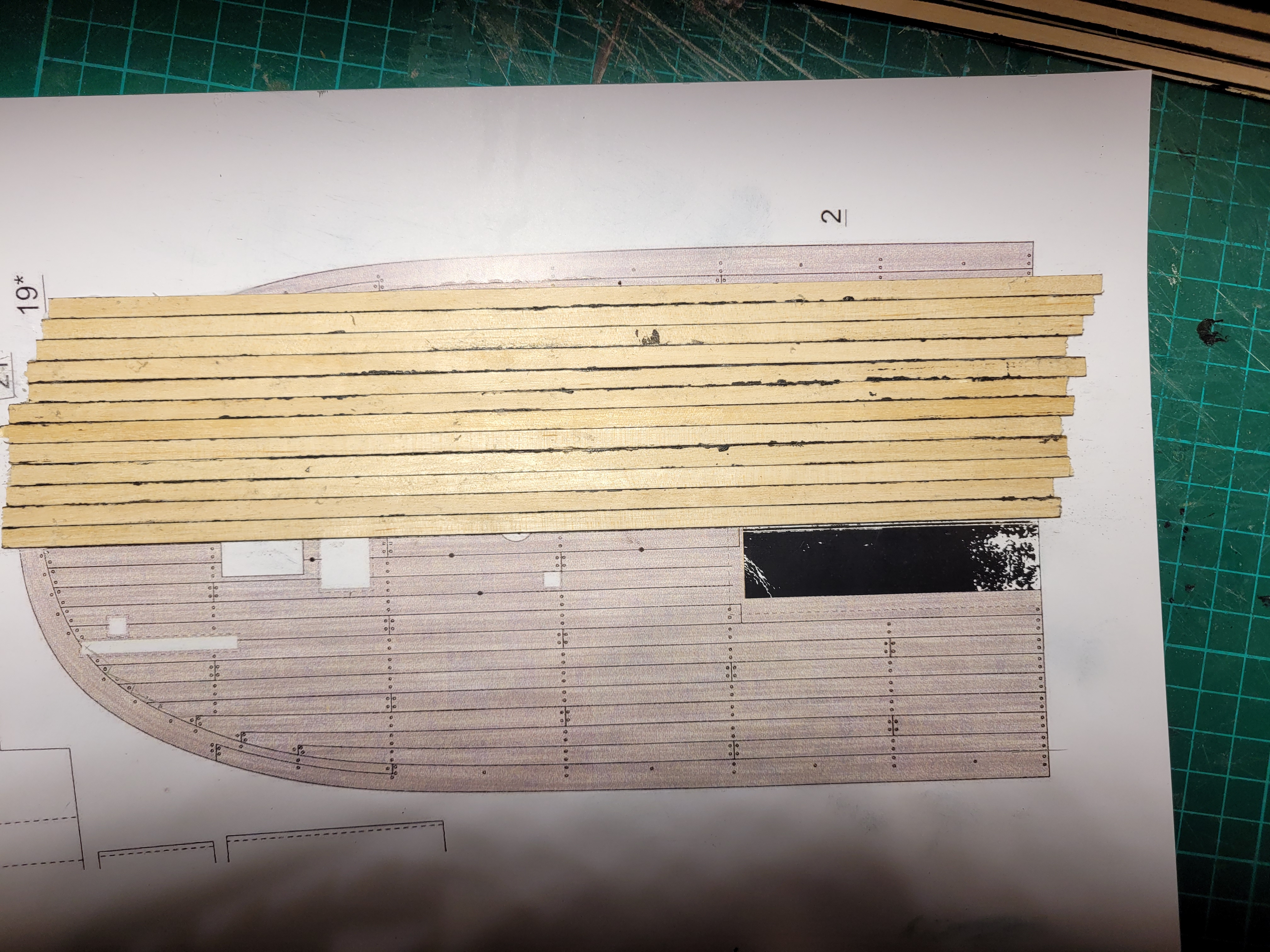 Pokłady wykonane z listewek brzozowych gr ok1,5 mm. Krawędzie w pakietach lekko smaruję białym klejem, żeby zabezpieczyć przed wsiąkaniem tuszu w listewki i po lekkim podeschnięciu na to biały klej zmieszany z tuszem (ja stosuje Patex). Listewki rozdzielam jeszcze jak klej jest wilgotny. Listewek nie rozcinam na dł planek, tę czynność robię po przyklejeniu wszystkich listewek, doszlifowaniu powierzchni ( można to robić mechanicznie na szlifierce, klej z tuszem nie rozmazuje się). Miejsca łączeń planek lekko smaruję białym klejem, robię nacięcie skalpelem i zacieram znowu klejem z tuszem. Banalnie proste, oszczędzające pół życia i unikamy problemu mijania się i łączenia planek a nuż o różnych szerokościach i powstawaniu szpar.