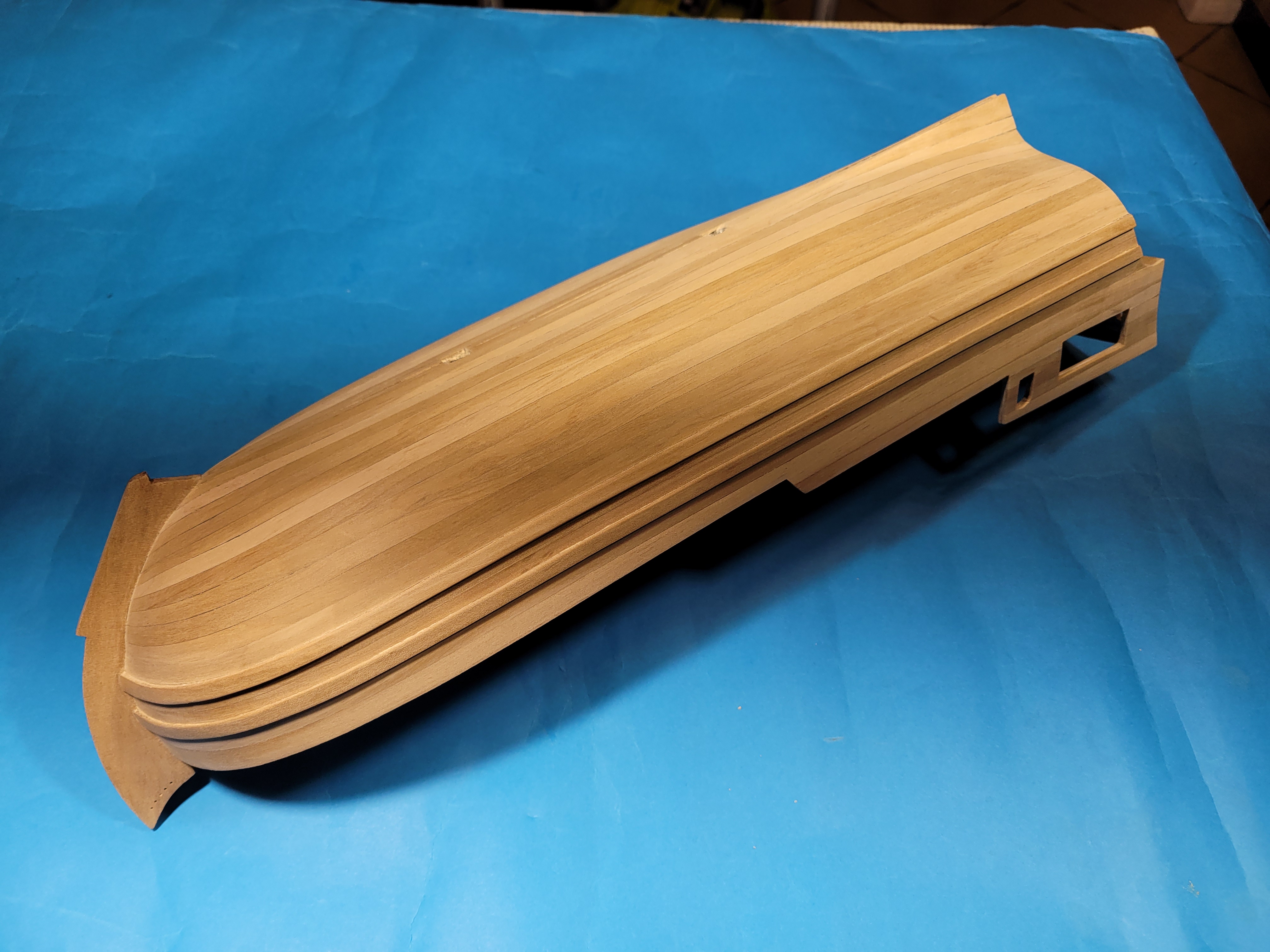 Doklejone nadburcia i wklejone od wewnątrz planki. Pozostałe nierówności na zewnętrznych burtach wyrównane szpachlą samochodową. Kadłub gotowy do poszywania.