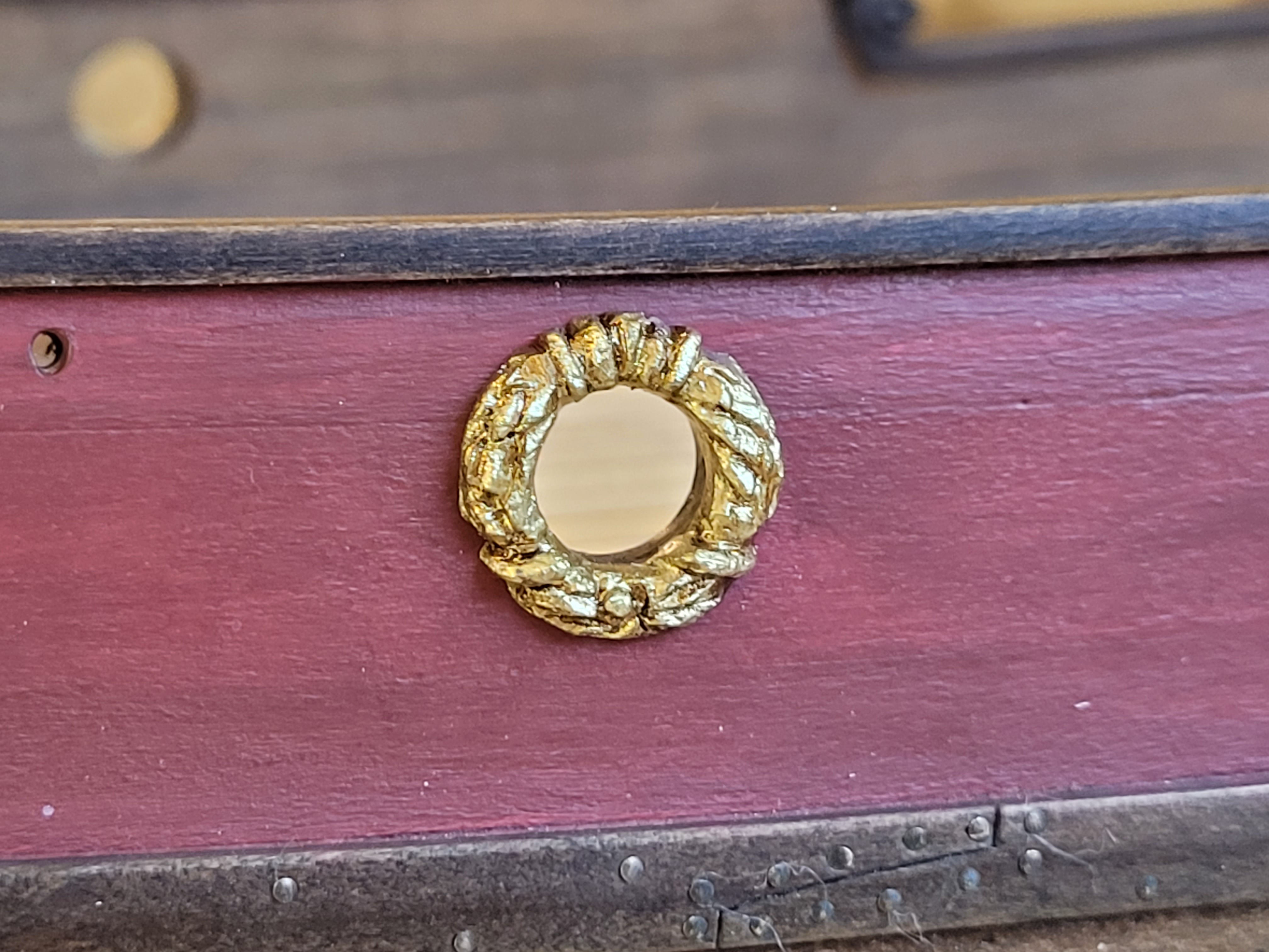 Sporo czasu zeszło mi przy wykonaniu ornamentów wzdłuż burt i wypracowaniu sposobu jak to zrobić. Wykorzystałem masę green stuff, a sposób to przyklejanie na wzór na kartce wałeczków z tej masy o średnicy ok 0,5-1mm i formowanie tych wywijasów. Po stwardnieniu odcięcie skalpelem od kartki, wyrównanie krawędzi i malowanie.