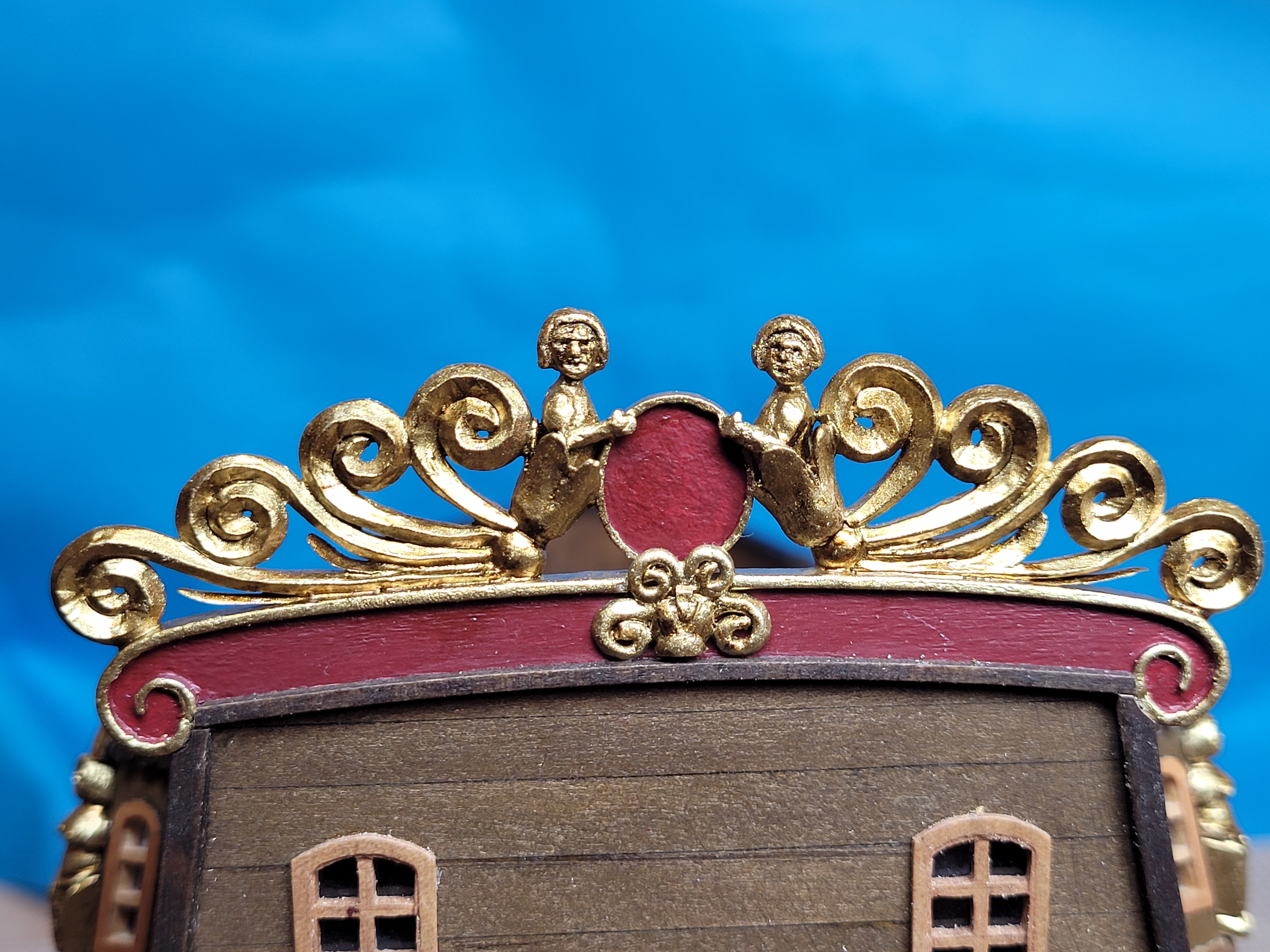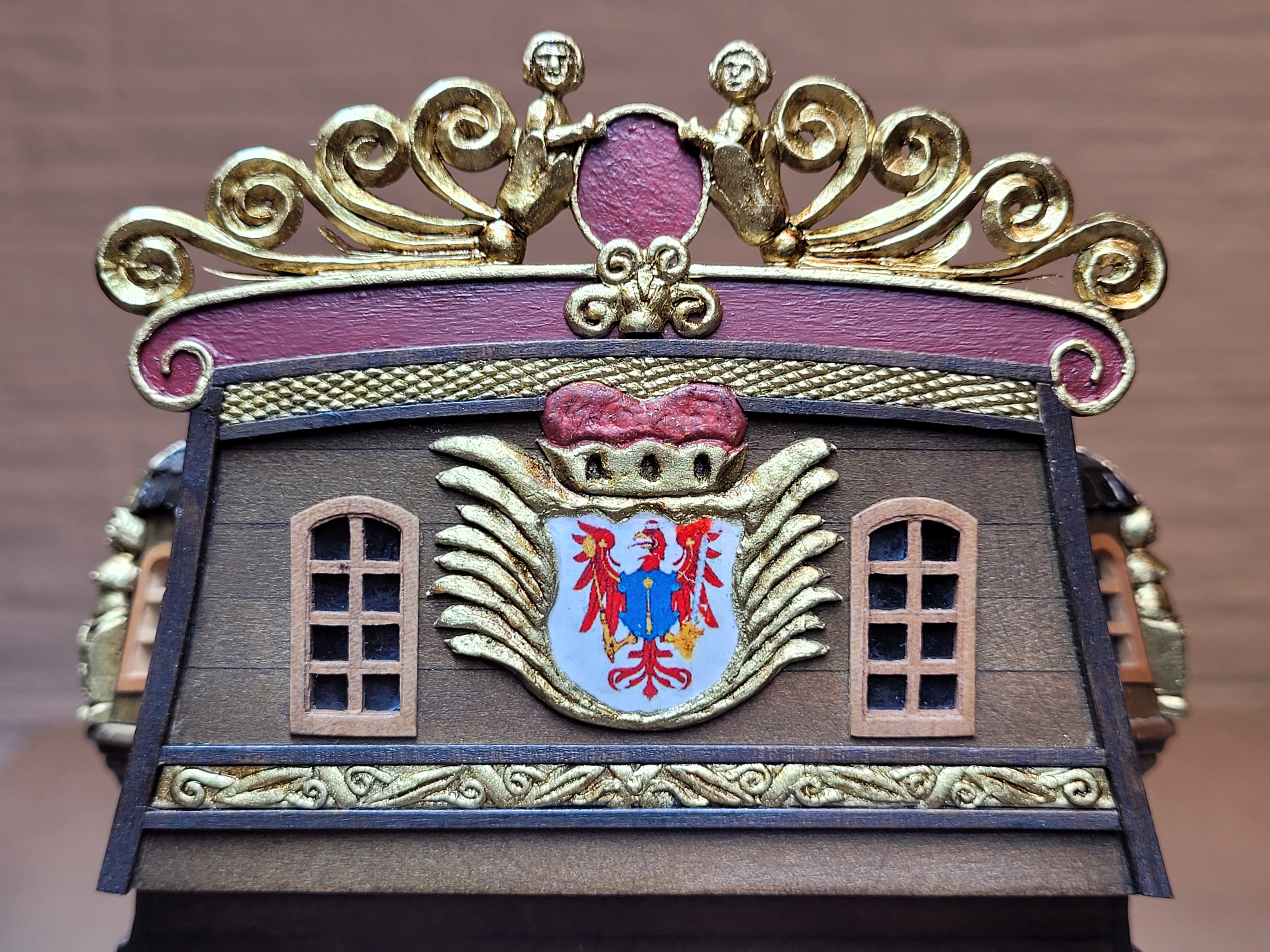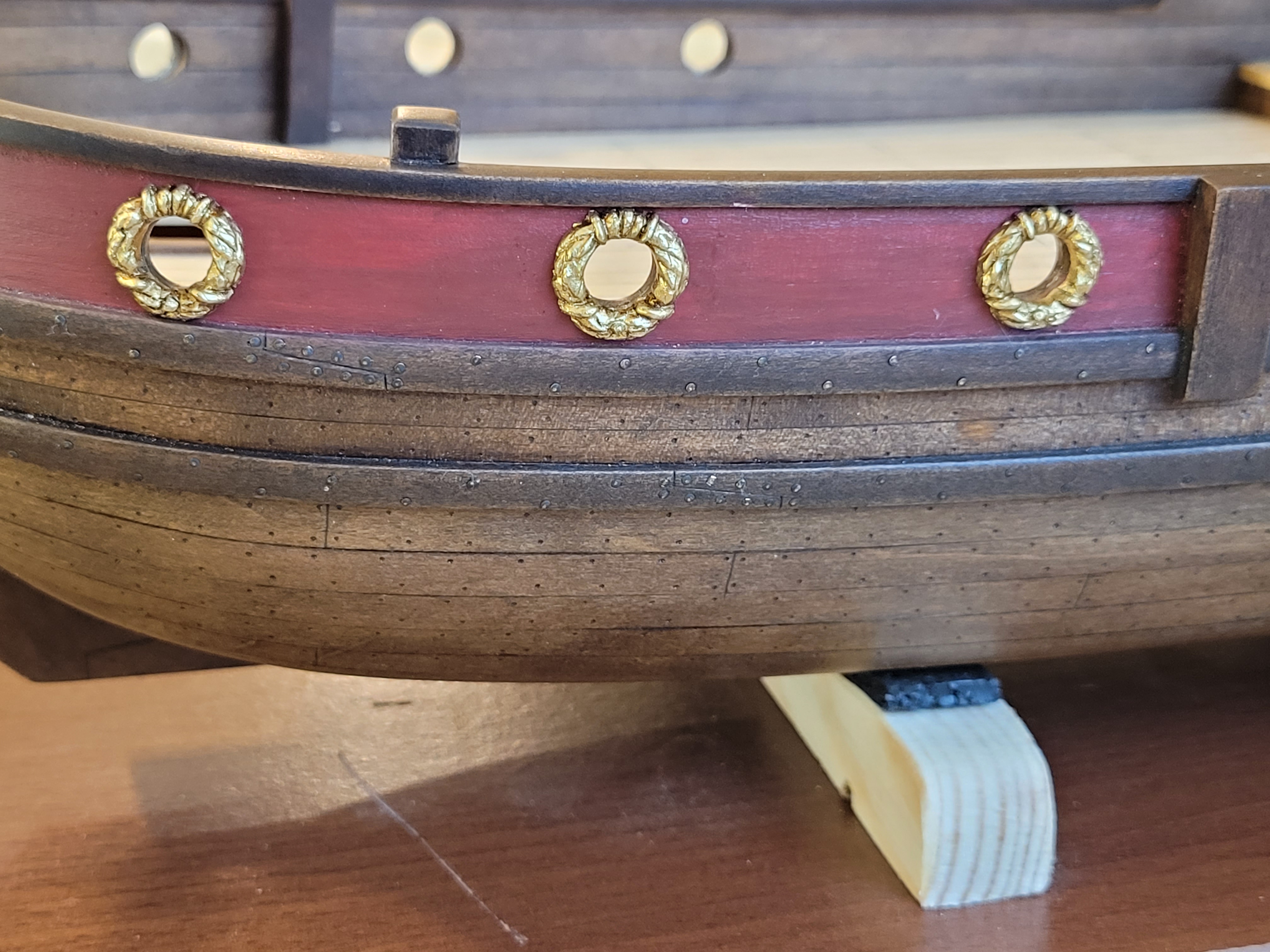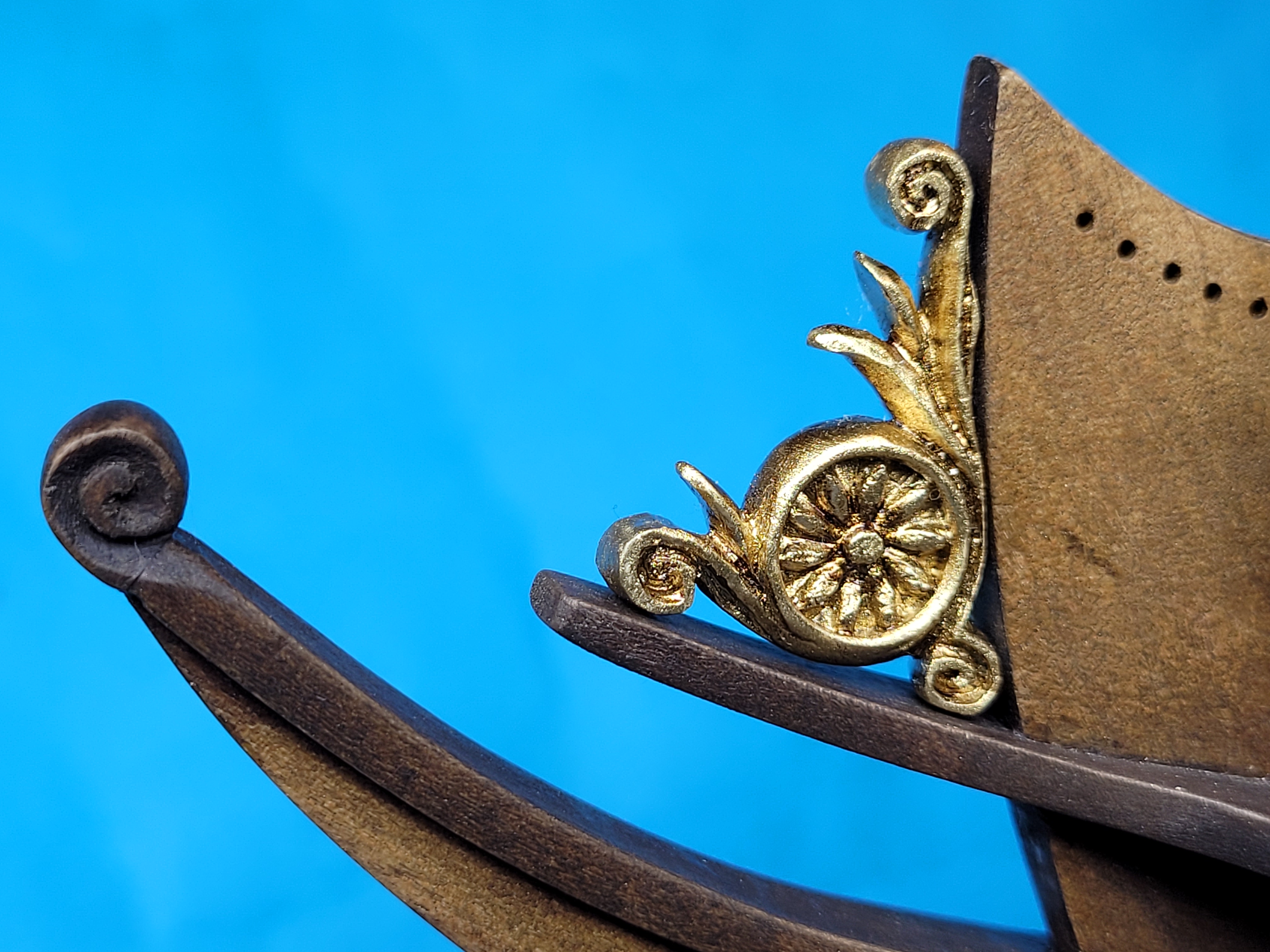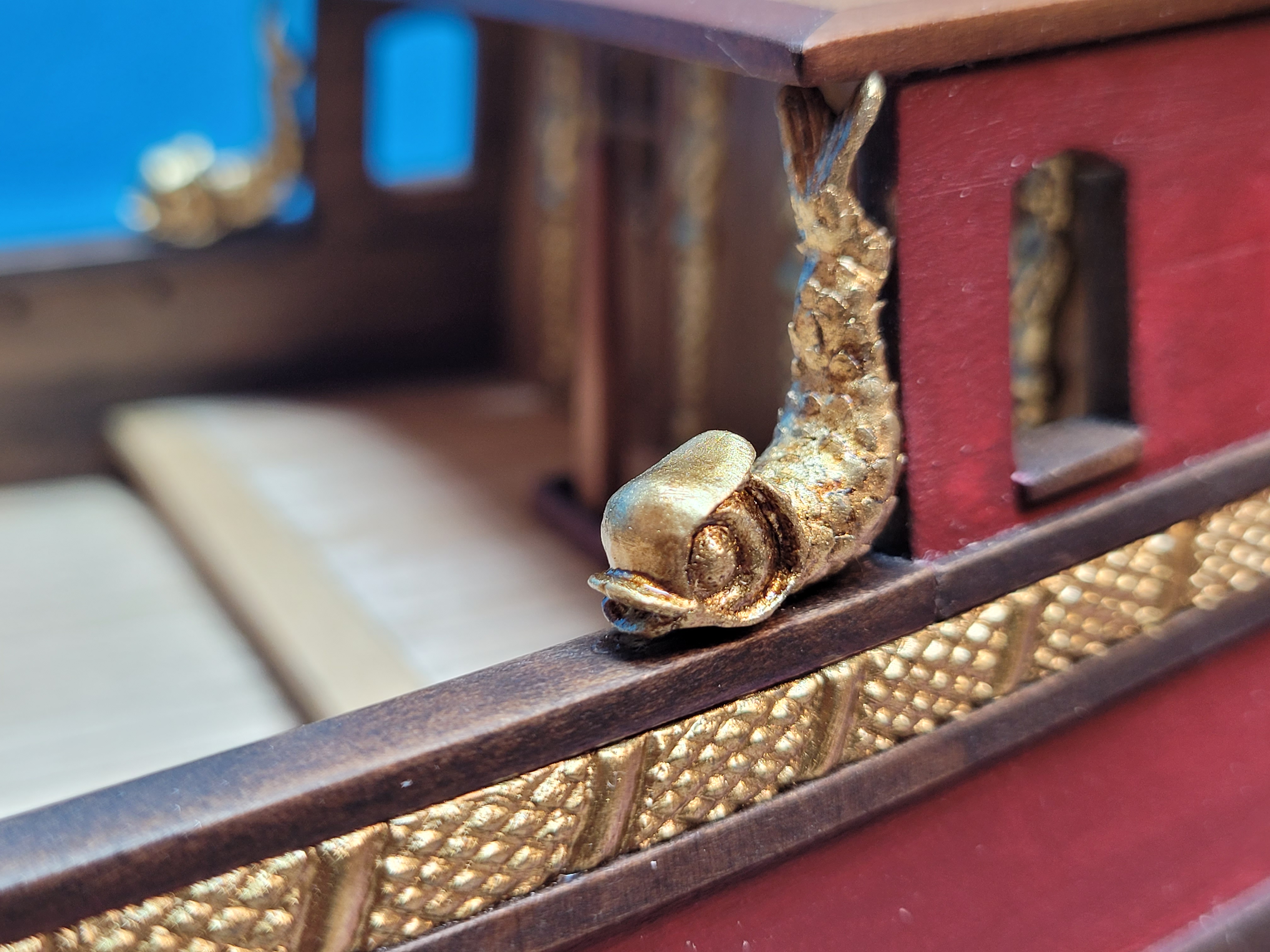, chociaż zwykle końcowy efekt, to kwestia wielu prób. Do rzeźby na dziobie podchodziłem kilka razy między innymi z modeliny, odlewu i wszystko wylądowało w koszu. Po raz pierwszy spróbowałem dłubania w bukszpanie, wstępnie co się dało wyfrezowane a dalej nożyk. Zdobione listwy na burtach wykonane metodą odlewu, najpierw wykonałem stemple z bukszpanu dla uzyskania powtarzalnego wzoru odciskanego w plastelinie.
