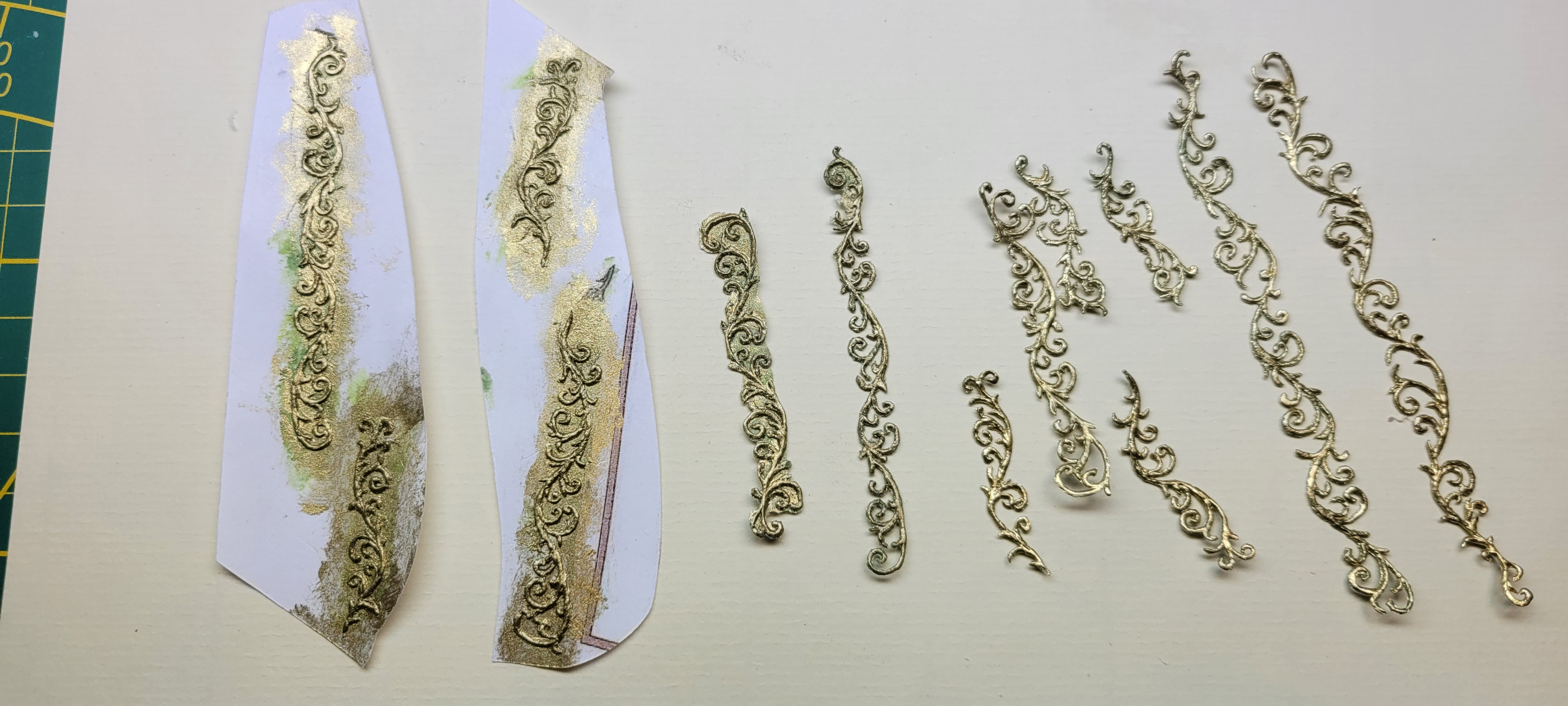 Dzięki Ryszard. Z wytrzymałością nie było problemu, ta masa green stuff jest po stwardnieniu bardziej elastyczna niż krucha, ponadto tak jak spojrzysz na pierwsze zdjęcie to pierwsza i druga "kolumna" tych ozdób jest jeszcze naklejona na kartce, trzecia, czwarta już odcięta ale z widocznymi resztkami papieru, to musiałem jeszcze poobcinać, więc papier spełnij pod spodem dodatkową warstwę wiążącą. Sporo z tym było dziubania, ale nie wymyśliłem nic lepszego.
