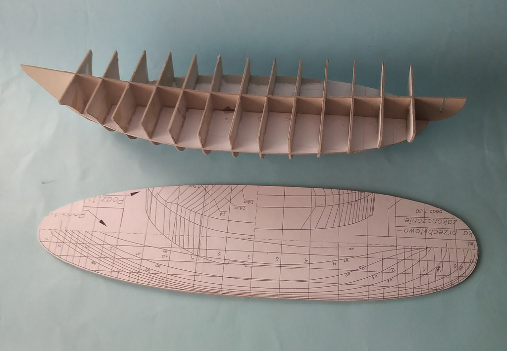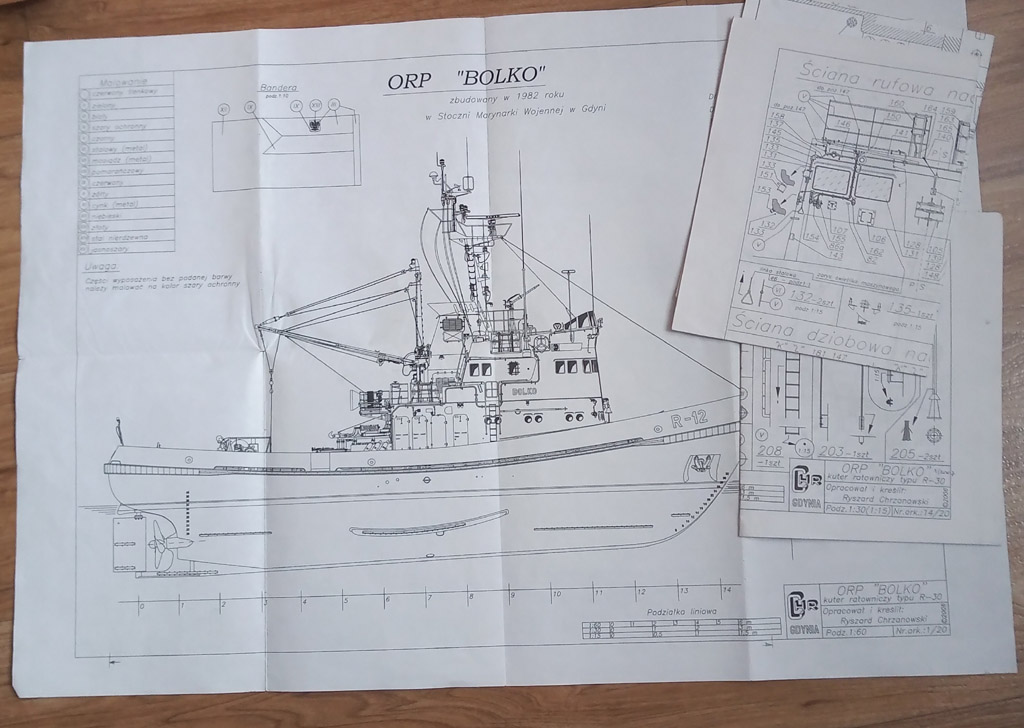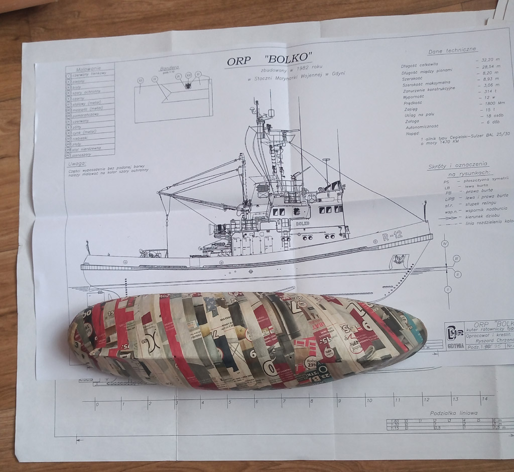 Zastanawiałem się jaki wybrać następny model do lepienia . Mam ulepione kutry ratownicze typ R-17 Halny , R-27 Sztorm 2 oraz statek ratowniczy SAR-3000 Orkan . Postanowiłem ulepić następny R-30 ORP Bolko -będzie do kompletu . Model będzie robiony na podstawie planów zamieszczonych w Modelarzu z 2006roku .Mam nadzieje że jakoś sobie poradzę bo wygląda na trudny . Po przeskalowaniu do 1:75 (w planach 1:30) zrobiłem kadłub i wypełniłem styropianem , następnie okleiłem paskami papieru . Po wyschnięciu całość zaszpachlowałem - kadłub schnie to dorobiłem szablon nadburcia .
