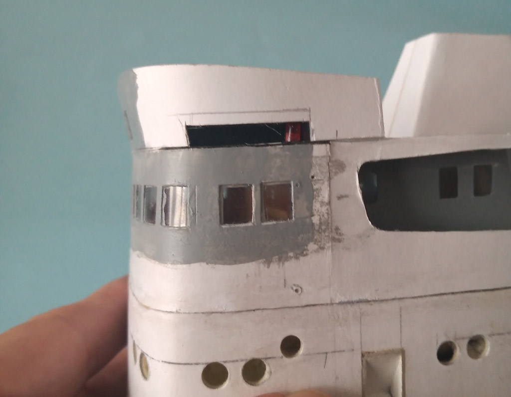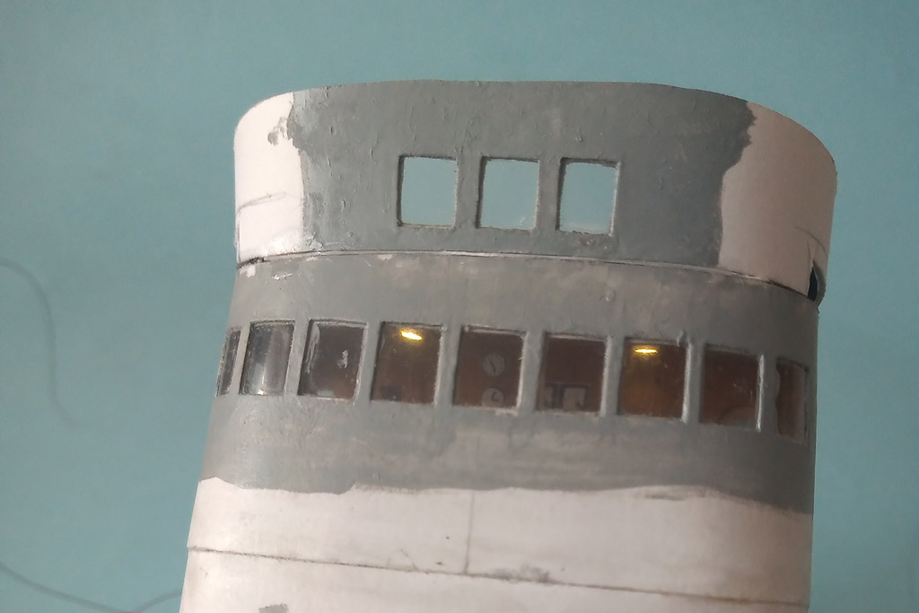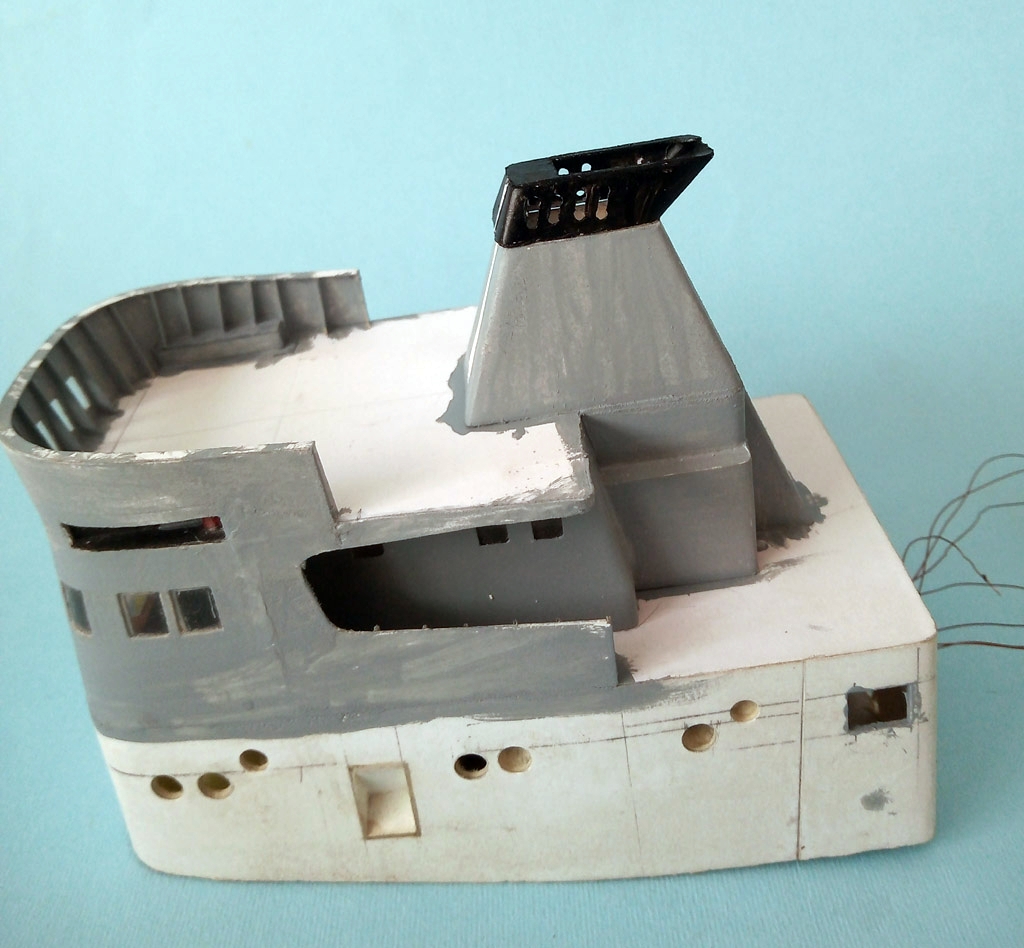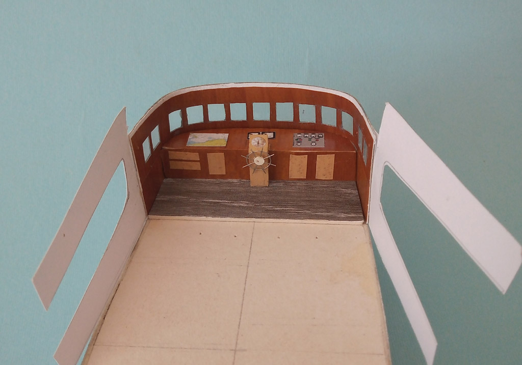 Zmieniłem trochę zamiar i zamiast czarnych okienek zrobiłem przezroczyste . W sterówce jest sporo i będzie widac wnętrze . Nie znalazłem nigdzie wnętrza sterówki ( autor planów też nie posiada ) więc wymyśliłem swoje . Kadłub pryśnięty podkładem trzeba mysleć o nadburciu