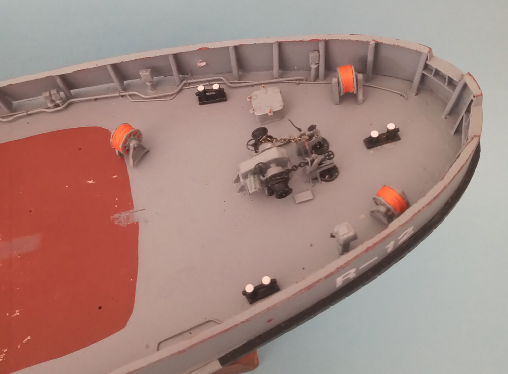 Coraz drobniejsze elementy to wolniej przybywa . Trochę pobawiłem się się z odbojnicami i upaprałem kadłub .Przetarcia na kadłubie będa retuszowane na koniec . Nadbudówka postawiona tylko do fotki