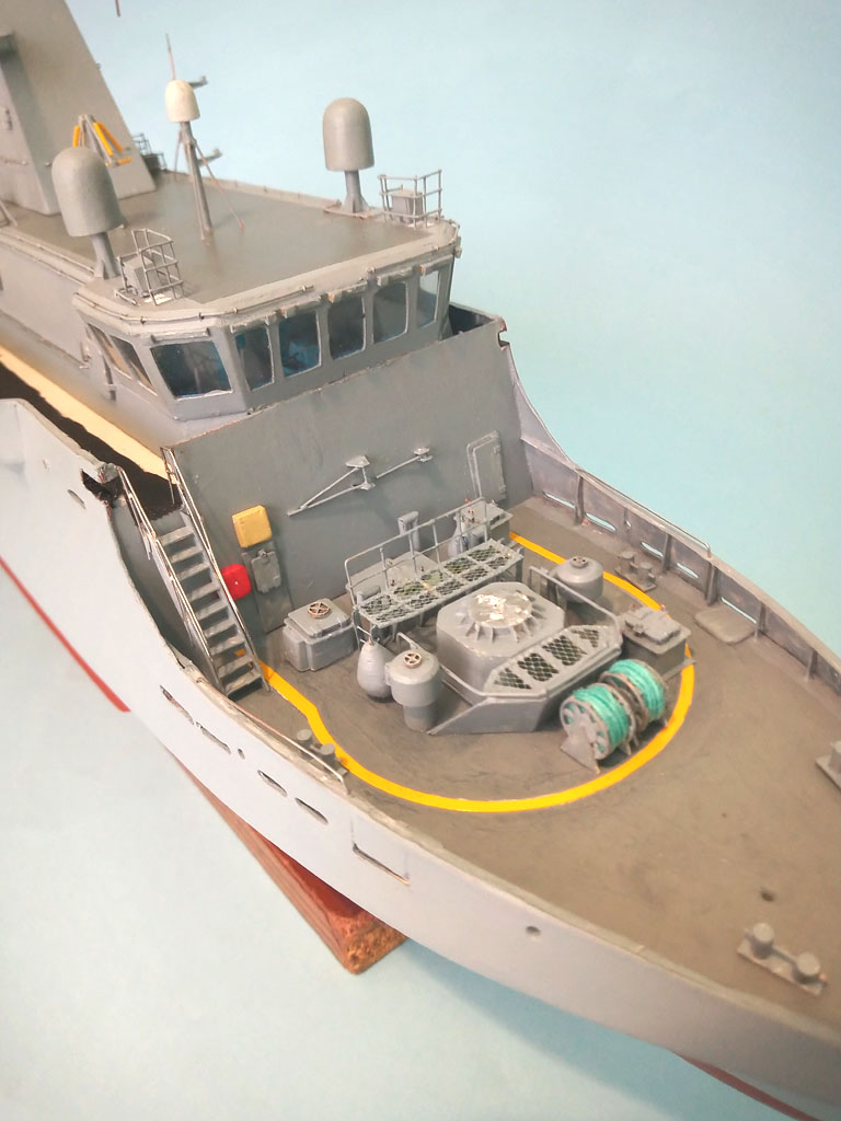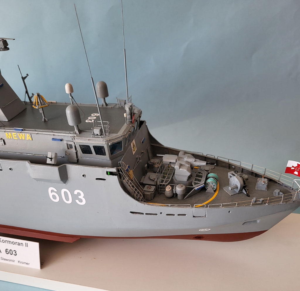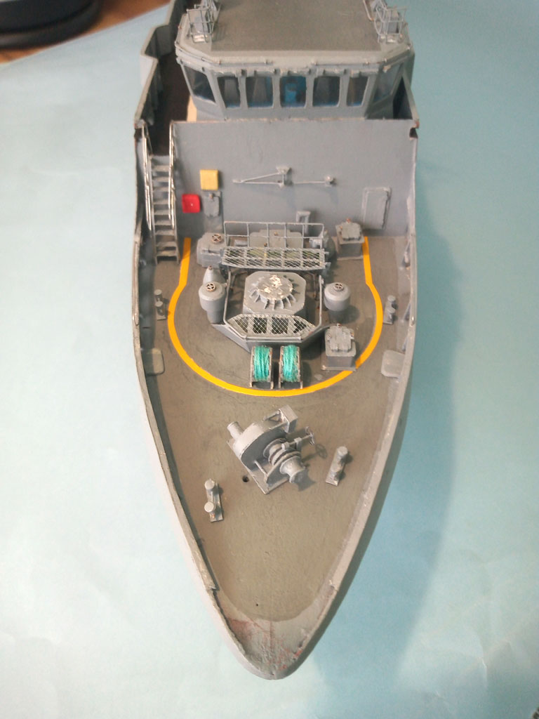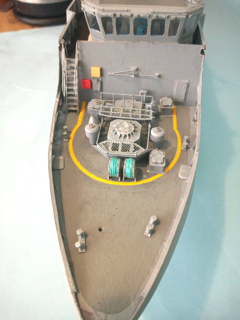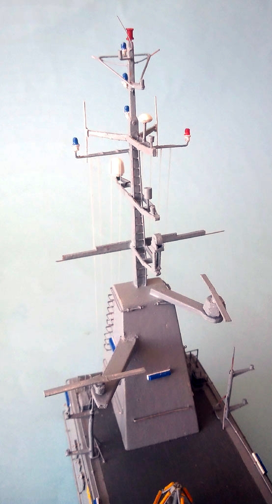 Upał to i kleić się nie chce . Trochę jednak zrobiłem - reling na dziobie jakieś światełka oraz zaczęty maszt . Zrobione oznaczenie jednostki teraz wiadomo że to będzie MEWA