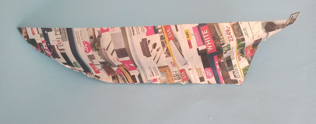 kadłub oklejony papierem gazetowym . Po wyschnięciu zaszpachlowany i odstawiony do schnięcia . Udało się ulepić trochę elementów na pokład do następnego spotkania