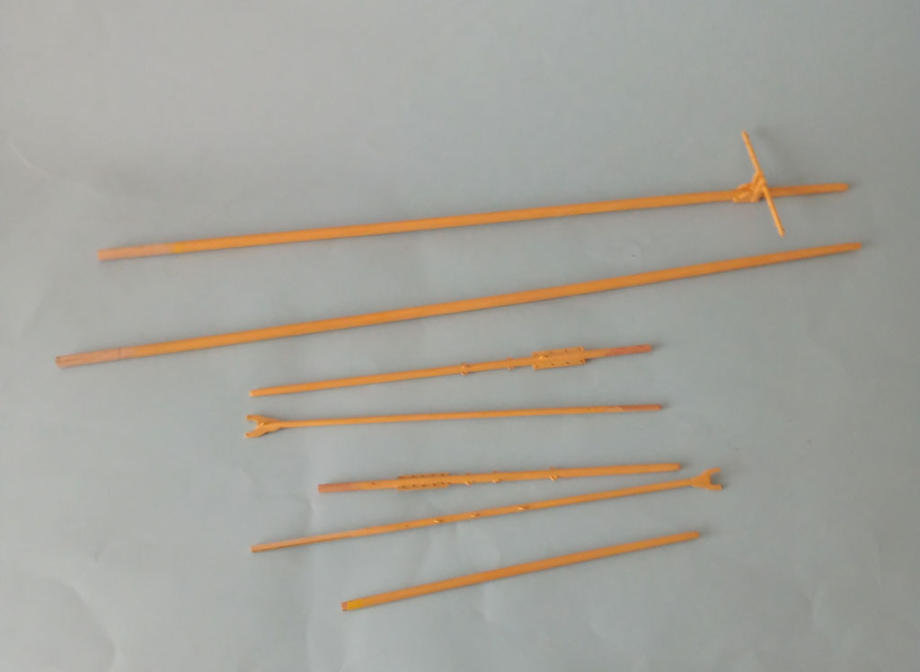 Kadłub pryśnięty podkładem to trzeba pomalować . Prysłem białym lakierem i wyszło bez problemu . Przy pryśnięciu czerwonym -problem . W miarę schnięcia pokazały się "pajączki" i trzeba było poprawiać . Wyszło trochę lepiej ale nie poprawiam . Kiedy farba schła udało się nastrugać trochę patyczków .
