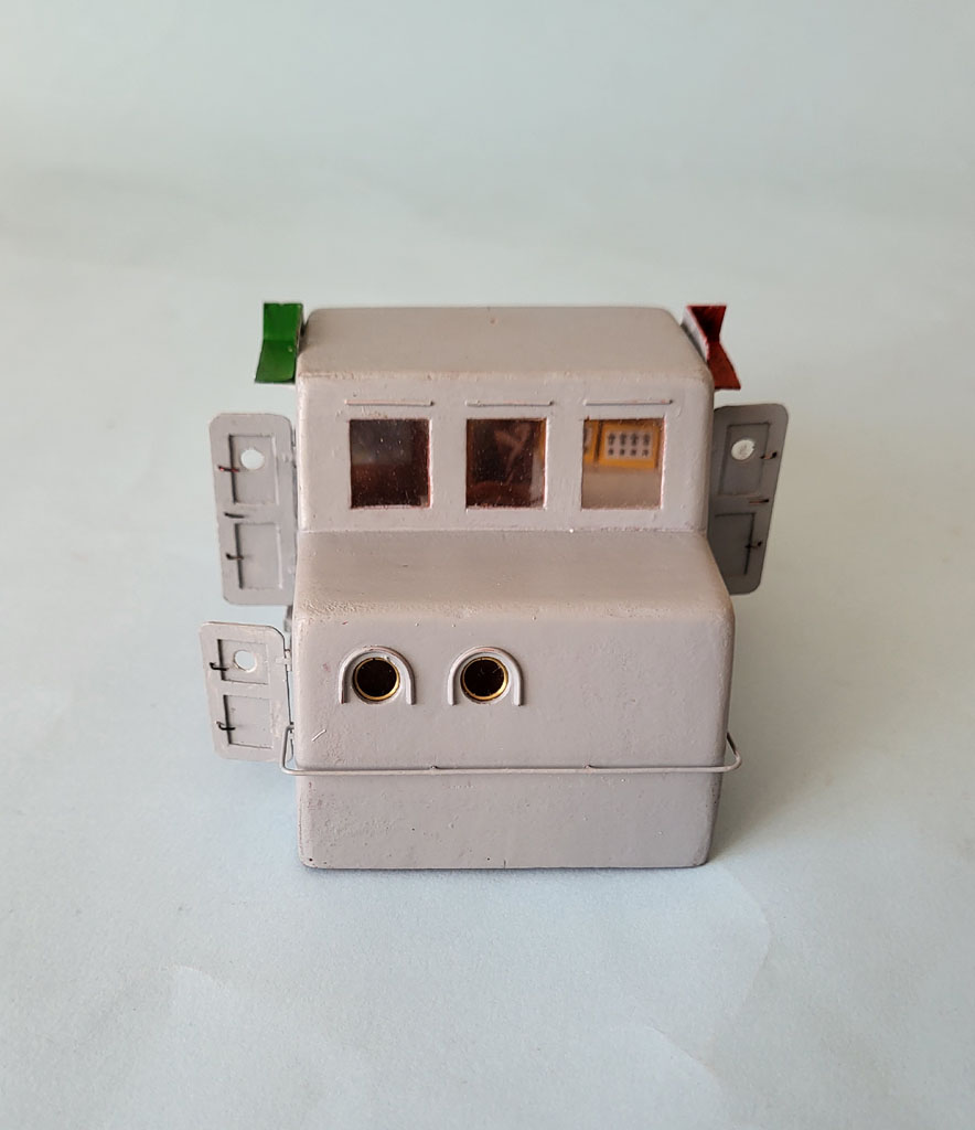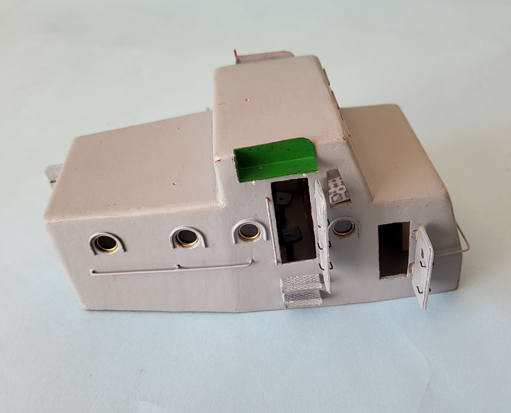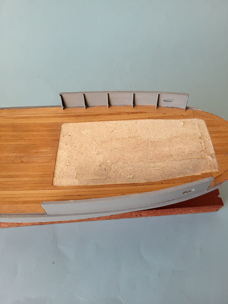 Dalsza zabawa z modelem . Trochę w sterówce zrobiłem zegary i koło sterowe aby nie było tak pusto . Dorobiłem nadburcie i szykuje do malowania . Nadbudówka tylko ustawiona do fotki
