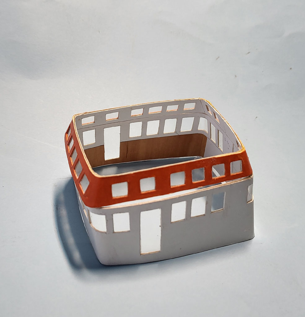 Szablony zrobione to trzeba bawić się dalej . Sciany sterówki gotowe to powycinałem trochę okienek a następnie oszkliłem . Dorobiłem także drzwi do nadbudówki