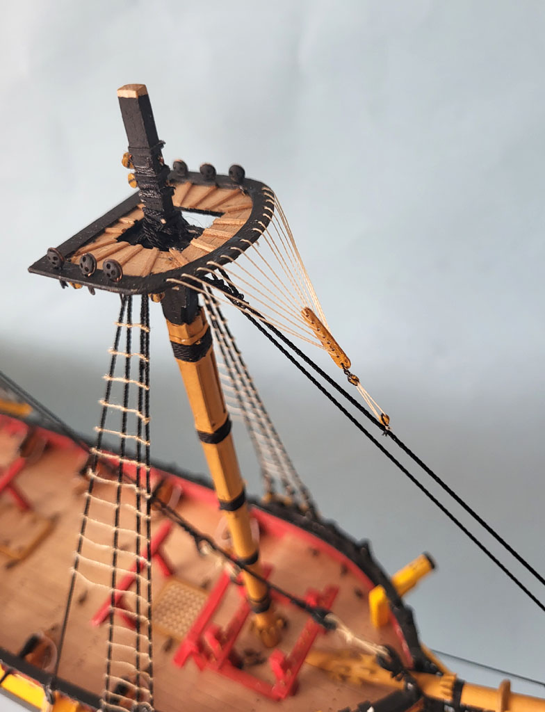 Maszty pomalowane to trzeba uzbrajać . Przy marsach zamocowałem bloczki i jufersy ,na ławie wantowej też . Zaczyna się zabawa z "niteczkami" - na pierwsze poszedł bukszpryt
