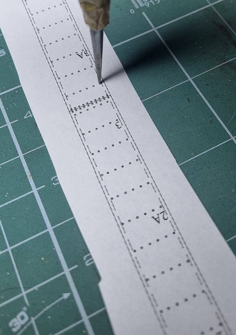 Dalsze części nadbudówek i wyposażenia sukcesywnie rysuję w CAD-zie i drukuję na drukarce laserowej na zwykłach kartkach A4 90gr. Dlatego też całość (z wyjątkiem oczywiście pokładu) po sklejeniu i obrobieniu jest malowana. Malowanie wyłącznie aerografami - pędzlem robię tylko poprawki. Używam farb akrylowych (Tamiya, Vallejo, AK).