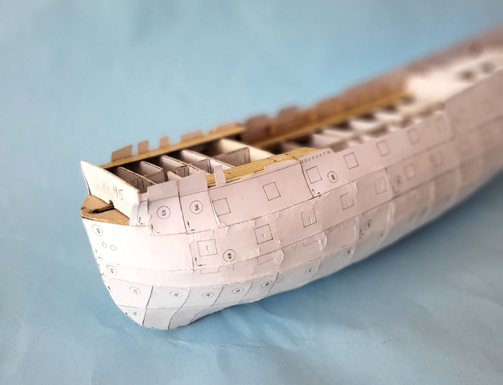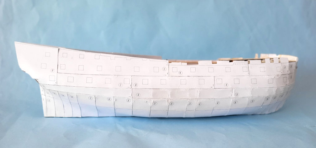 Robiąc przegląd tego co posiadam znalazłem zaczęty kadłub i ksero wycinanki HMS BELLONA . Model był zaczęty dawno temu - ze względu na brak miejsca wycinanka była przeskalowana z A3 na A4 . Brakowało schematu olinowania ale przysłał mi kolega któremu dałem wycinankę . Przeglądając arkusze doszedłem do wniosku że niektóre wymiary nie pokrywają się . Myślę że dlatego przerwałem dalsze lepienia - spróbuje tym razem ulepić a wygląda to tak