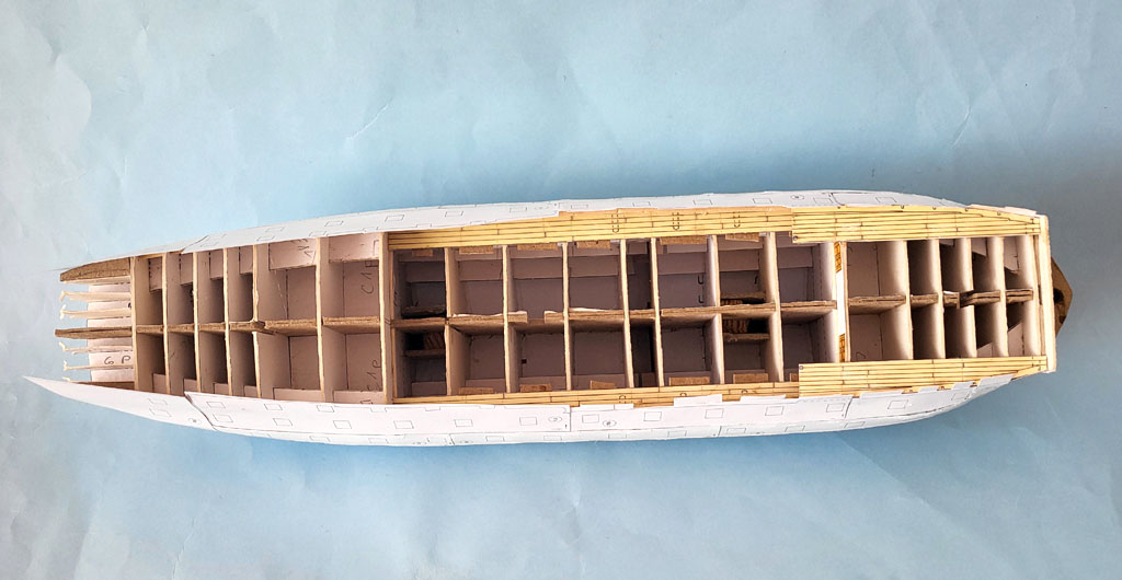 Pierwsze poszycie zrobione . Nie wyszło idealnie ale na tym etapie można uznać że jest do przyjęcia . Rozdzieliłem pokłady aby mieć dostęp do ustawienia lawet do następnego spotkania