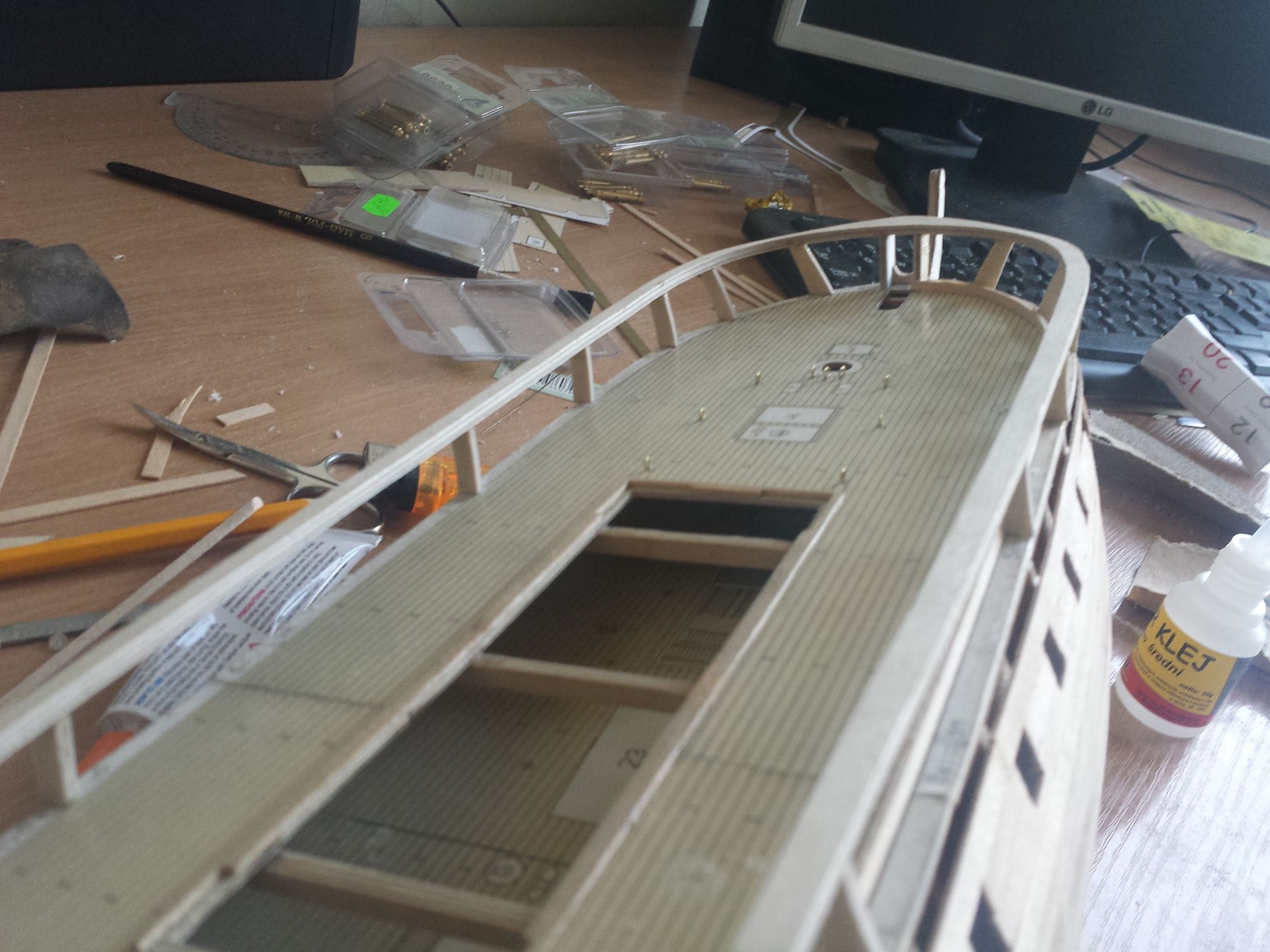 Model jest zwykłym modelem kartonowym w skali 1:100 wydawnictwa "fly model" wszystkie części zostały wycięte w drewnie... jedynie pokład i bocianie gniazda zostały oklejone elementami papierowymi ponieważ nie czułem się na siłach wykonać z listewek... Mój warsztat jest jest bardzo skromny ponieważ do dyspozycji maiłem jedynie piłkę włośnicową i papier ścierny... Załączam jeszcze dwa zdjęcia z budowy kdłuba... Konstrukcja wręgowa... kiedy robiłem model nie wiedziałem jeszcze że można robić kopytka