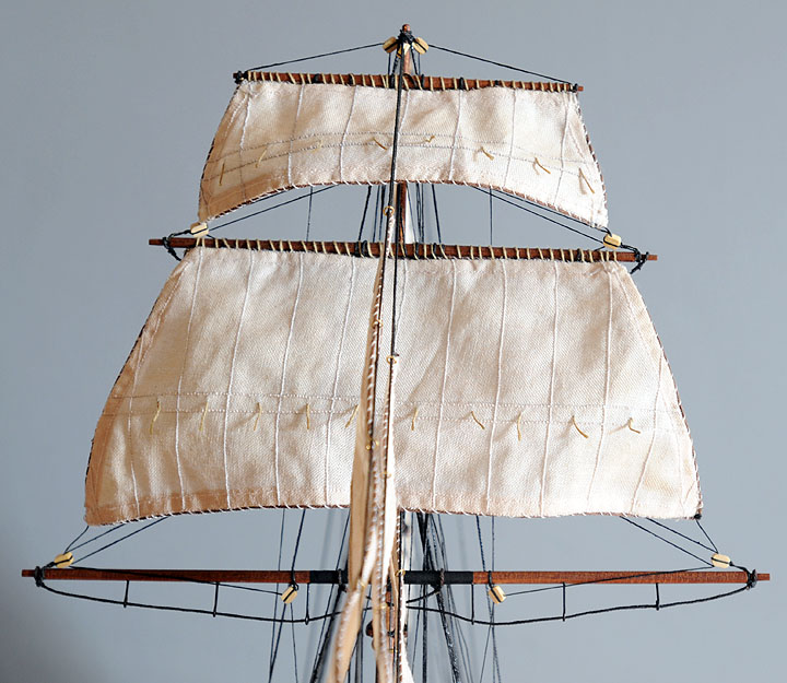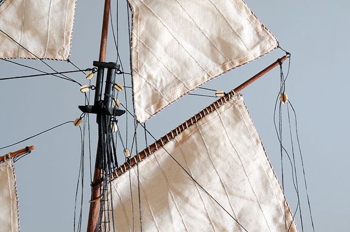 Nie żebym się czepiał ale czy nie powinno być więcej pierścieni mocujących żagiel do masztów . Z kolei chyba ciut za dużo przeszyć mocujących żagle do rei żagli gaflowych ( a tu plama nie wiem jak się zwą ) Tak efektwizualny jak dotąd b. ładny.