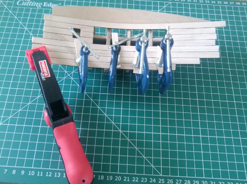 Witam ponownie. Jako że moja praca pozwoliła mi spędzić weekend w domu, ostro zabrałem się za sklejanie modelu. A więć na pokład użyłem jasnego klonu grubości 1.5mm. Najwięszy problem sprawiła mi imitacja uszczelnienia desek - to był istny koszmar. Po około 10 próbach doszedłem do tego jak w miarę nie zaciemnic powierzchni "deski" przy malowaniu krawędzi.