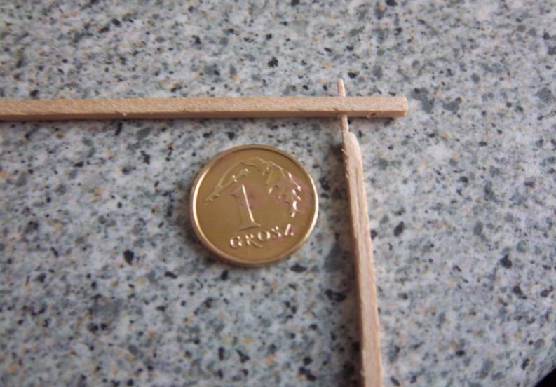 Z racji, że dostałem tymczasowy zakaz szlifowania i piłowania w mieszkaniu, musiałem użyc 2mm patyczki zamiast 1mm. Skalę zakłamałem już przy samym początku powiększając pewne elementy(świadomie) także wielkiego dramatu nie powinno być i w tym przypadku. Zapomniałem dodać: na żagle użyłem woreczka parcianego po monetach. Po wycięciu musiałem "przejechać" krawędzie lakierem bezbarwnym bo sie pruło jak stare gacie. Nic innego nie przyszło mi do głowy.