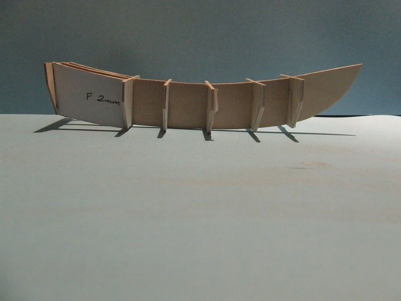 Dziś szkielet posklejałem przy pomocy wybudowanej stoczni (plany wg. K&M) do etapu widocznego na zdjęciach => wszystko jest PRZED szlifowaniem więc są widoczne niedokładności.