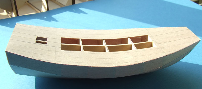 Jestem bardzo zadowolony z poszycia kadłubu, jednak mniej z poszycia pokładu, a najmniej z podłogi w ładowni... Nauka jednak nie poszła na marne. Teraz już wiem jak pracować z fornirem.