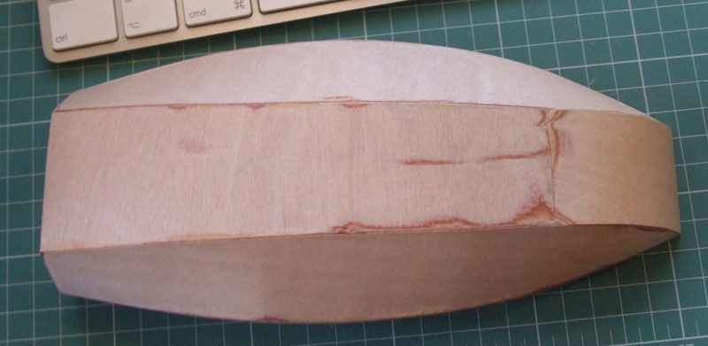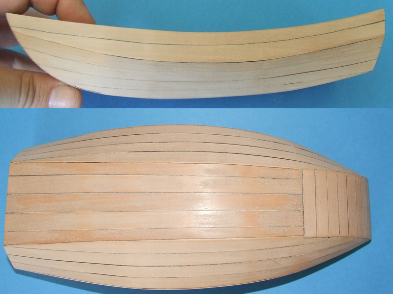 Listewki wycinałem za pomocą narzędzia o nazwie "Balsa Stripper". Bezproblemowo. Listewki jednak były jeszcze nawilżone gdy je wklejałem i teraz, niestety, powstały pół milimetrowe przerwy w poszyciu... Widać to na jednym ze zdjęć. Czy próbować wkleić tam czarną nić, czy może zalać klejem i szlifować? Obawiam się, że szlifując zepsuję efekt czarnych połączeń (listewki czernione pisakiem na krawędziach). W zasadzie nie wygląda to tragicznie... Czy rzuca się Wam w oczy na zdjęciu?