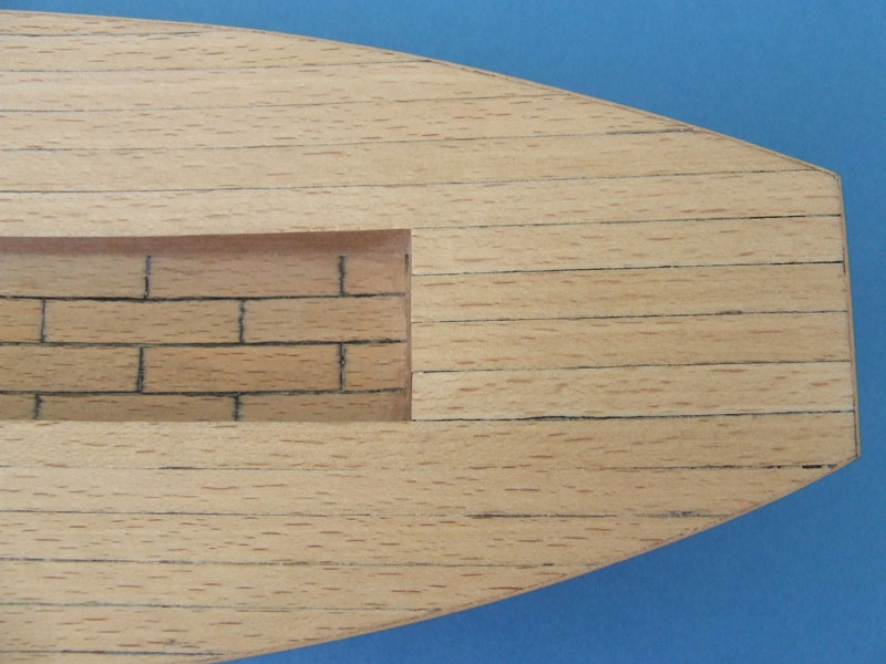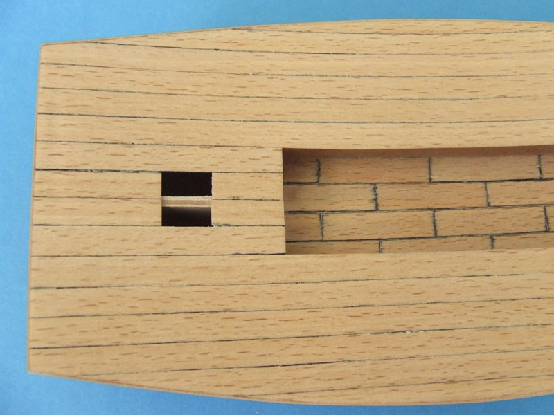 Wnęka kryta listewkami wykonanymi z forniru brzozy, wymiary 7x30. Czy nie za krótkie? Nie wiem jeszcze czy poszycie pokładu kontynuować takimi listewkami czy może zrobić po jednej listwie na długości. Wnęka i tak będzie raczej zakryta po złożeniu nadbudówki. Do wnętrza będzie się zaglądać po zdjęciu płyt z "dachu".