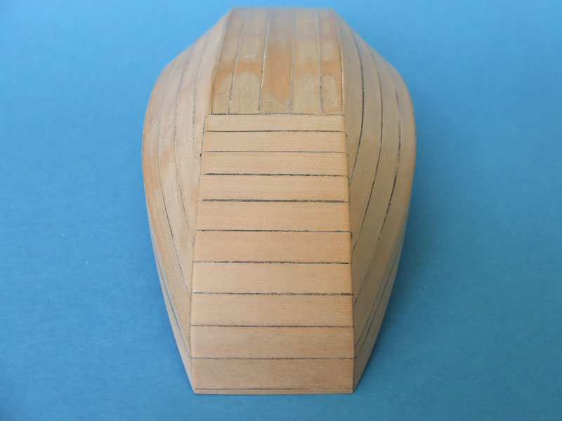 Zostaw tak jak jest i jedź do końca. Nie ma sensu zrywać dobrze zrobionego pokładu. Kup olej v33 i zaolejuj, będzie lepiej. Albo przejedź bejcą burty, żeby były ciemniejsze od pokładu. Te proporcje symetrii to też histeryzujesz niepotrzebnie. To model treningowy, a ty robisz go świetnie. Skończ go i jak Cię będzie meczyć, to tego dasz komuś a zrobisz nowy, według swoich spostrzeżeń.