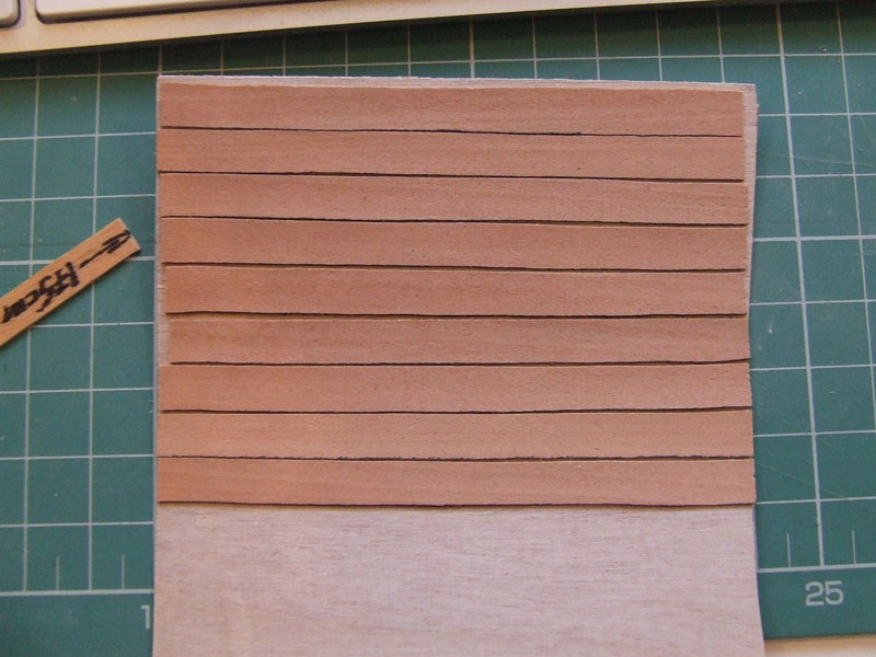 Zrobiłem sobie taką atrapę poszycia i jutro będę robił próby z bejcowaniem i olejowaniem, a potem spróbuję coś do tak przygotowanego elementu doklejać różnymi klejami :) . Odstępy między listewkami zrobiłem celowo, ponieważ w kilku miejacach na poszyciu także takie mam..
