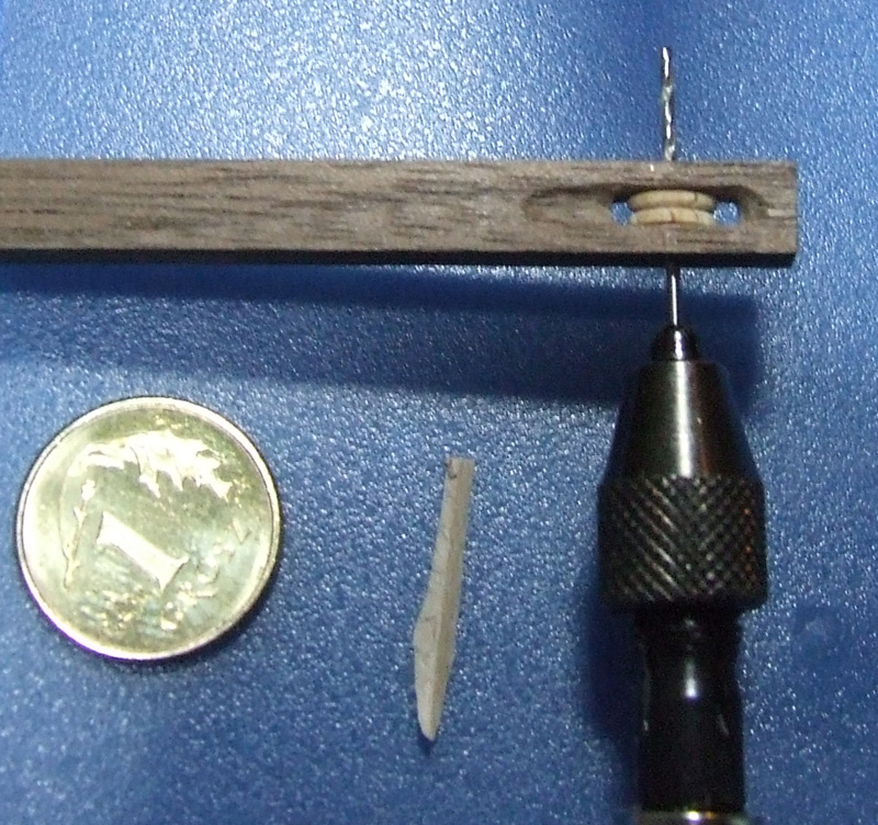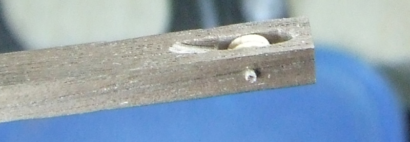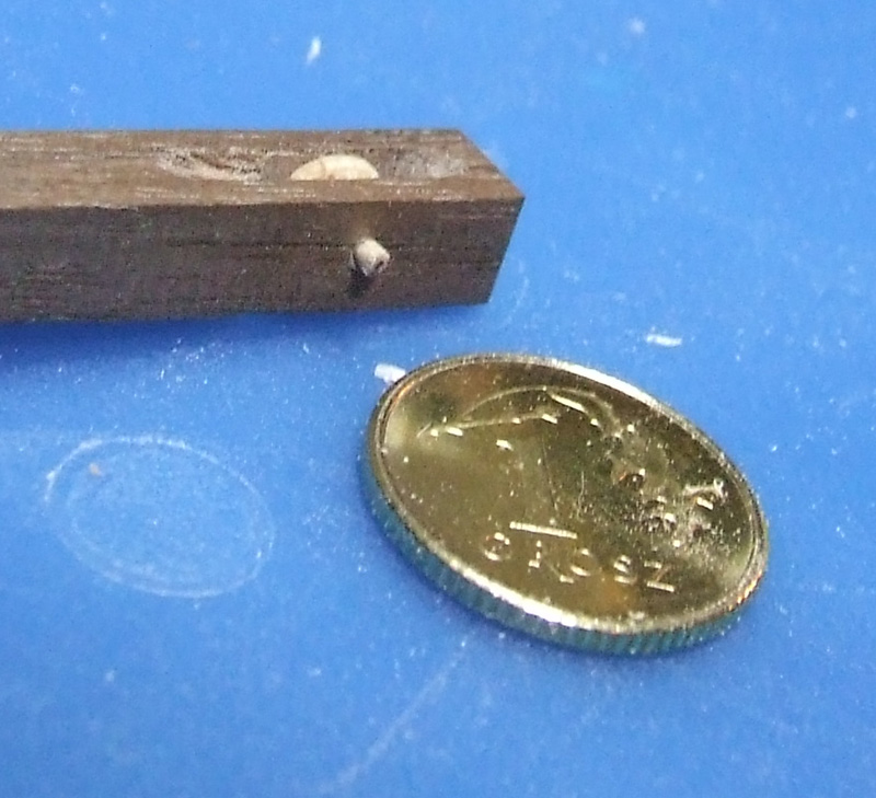Coś mi jednak nie grało więc zakołkowałem końce osi drzazgami z orzecha amerykańskiego. Nawierciłem ośkę najmniejszym wiertełkiem jakie miałem - 0.2 (przy okazji jedno złamałem